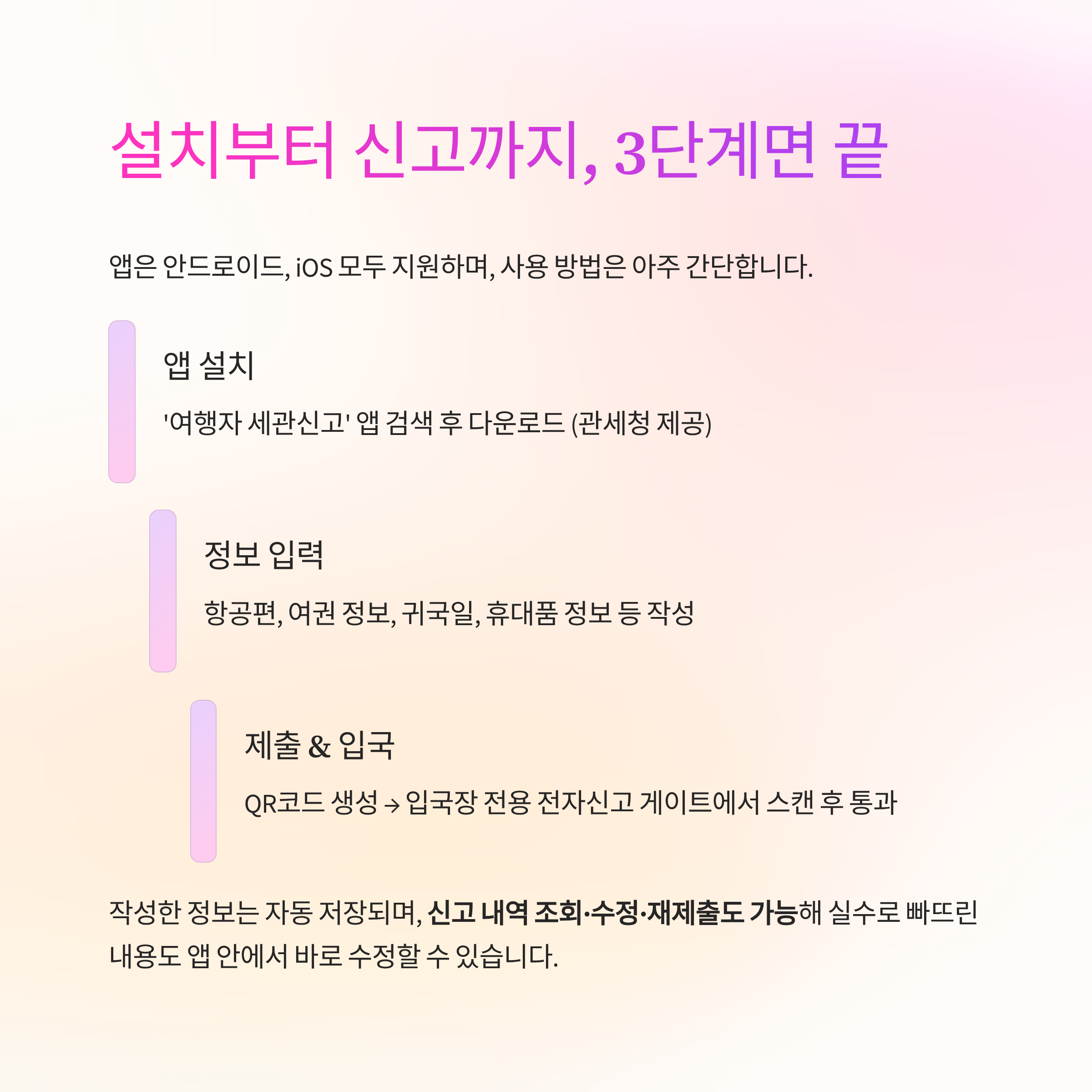 | 3. 제출 & 입국 | QR코드 생성 → 입국장 전용 전자신고 게이트에서 스캔 후 통과 |