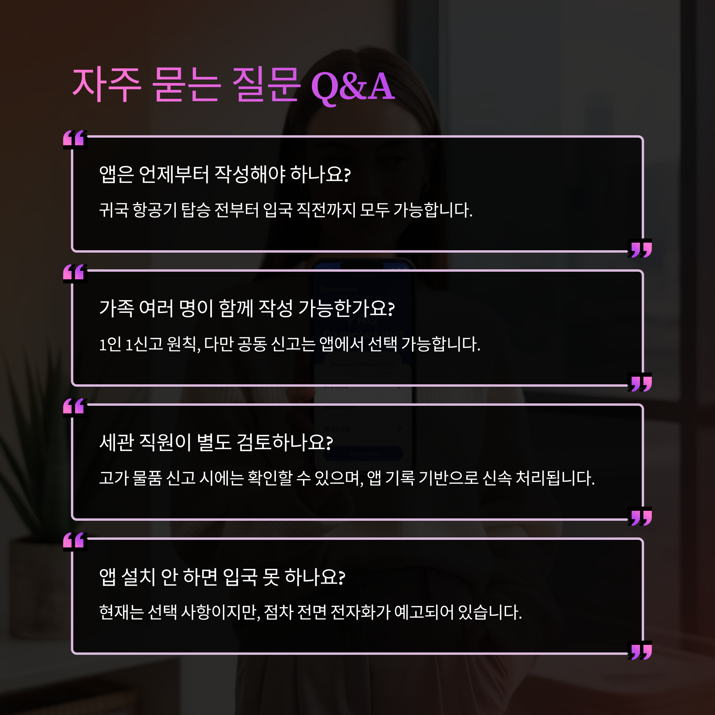 | 세관 직원이 별도 검토하나요? | 고가 물품 신고 시에는 확인할 수 있으며, 앱 기록 기반으로 신속 처리 |