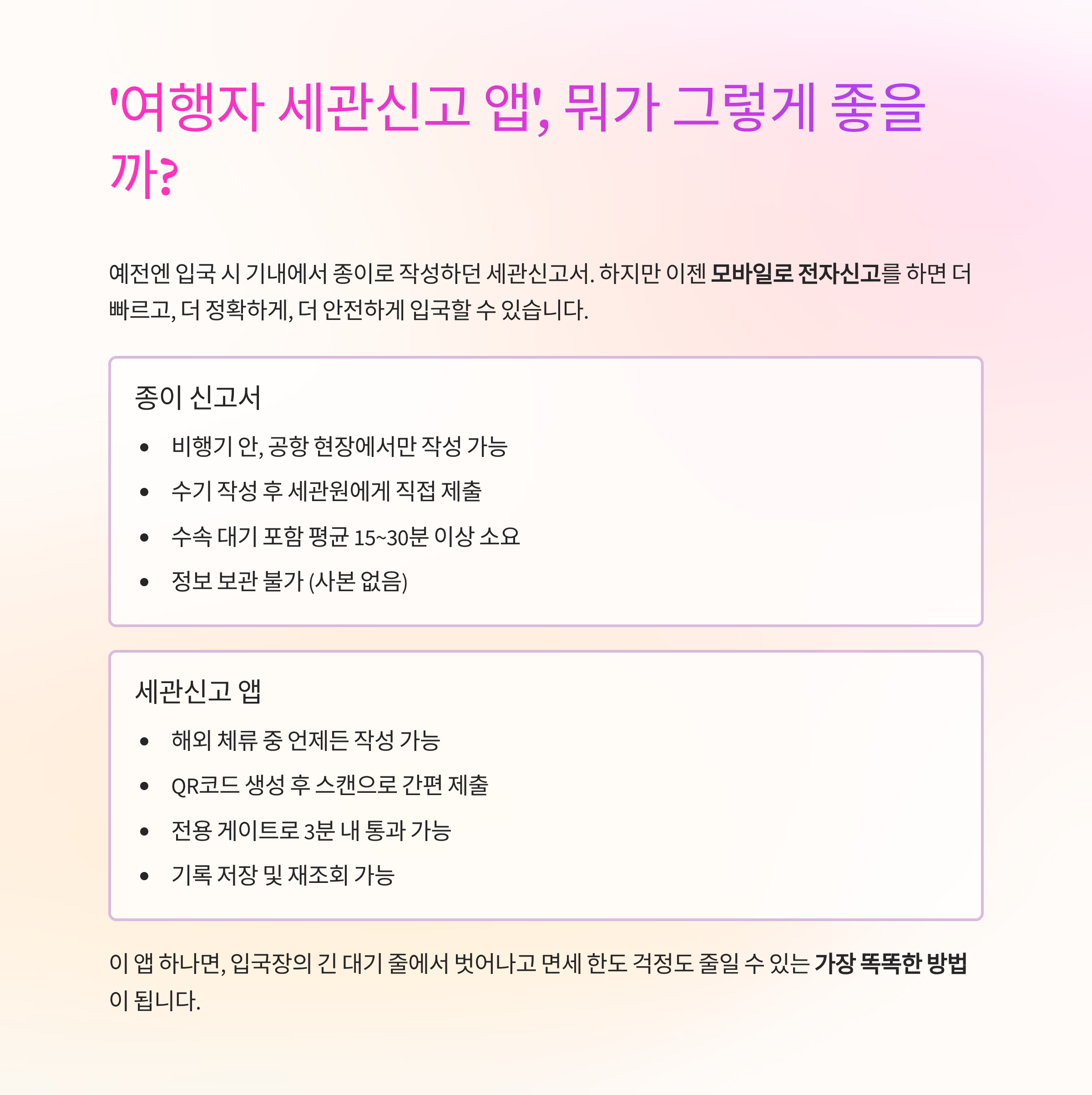 | 제출 방식 | 수기 작성 후 세관원에게 직접 제출 | QR코드 생성 후 스캔으로 간편 제출 |
