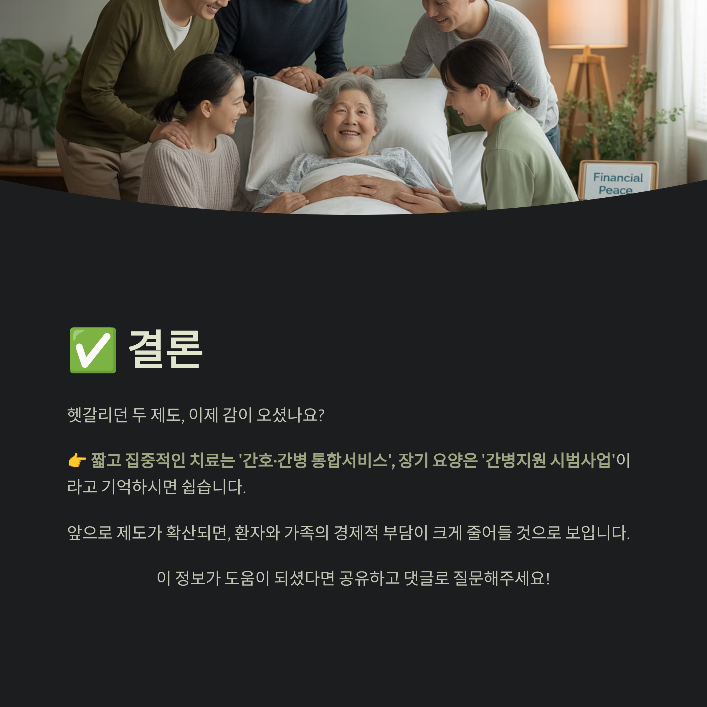 👉 **짧고 집중적인 치료는 ‘간호·간병 통합서비스’, 장기 요양은 ‘간병지원 시범사업’**이라고 기억하시면 쉽습니다.