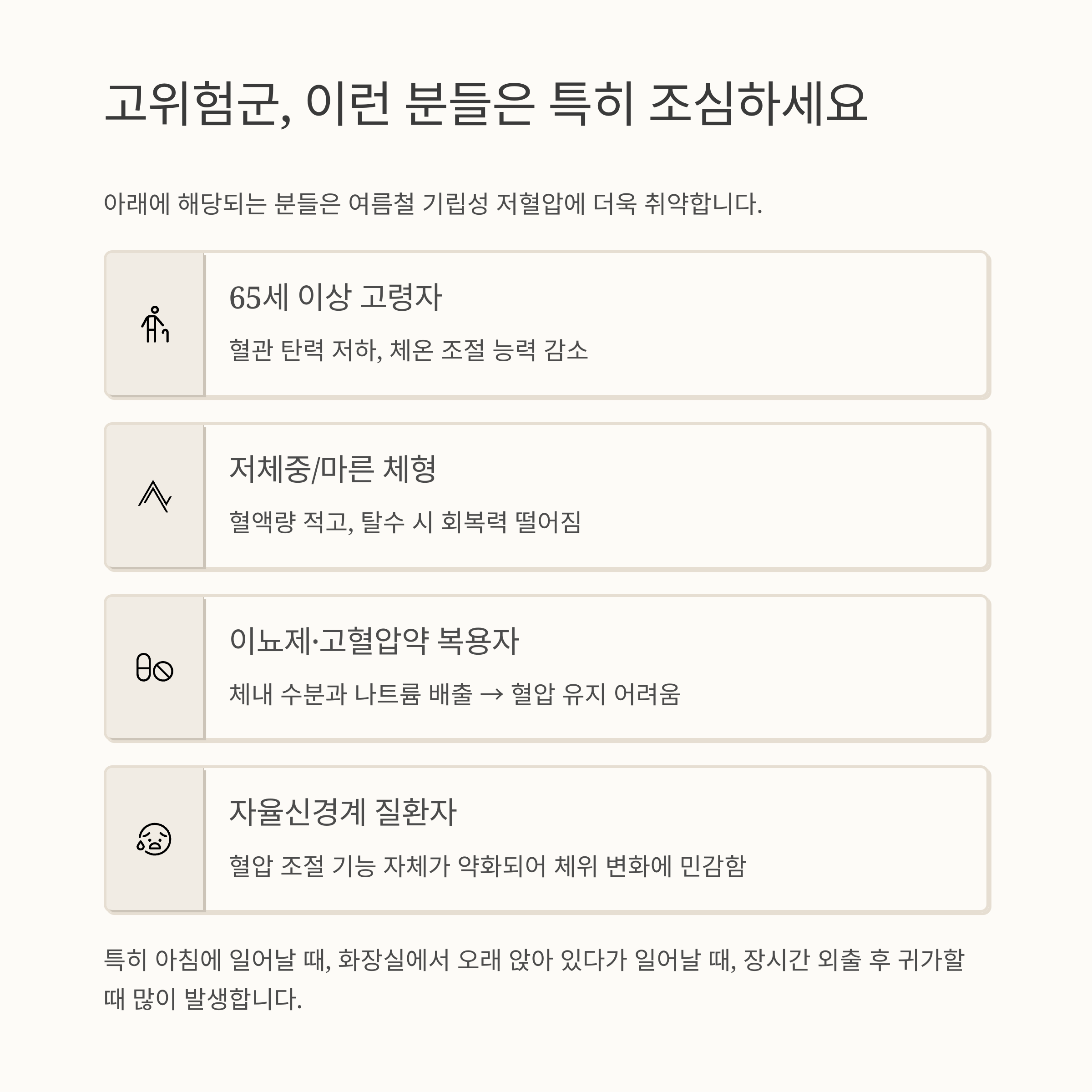 아래에 해당되는 분들은 여름철 기립성 저혈압에 더욱 취약합니다.