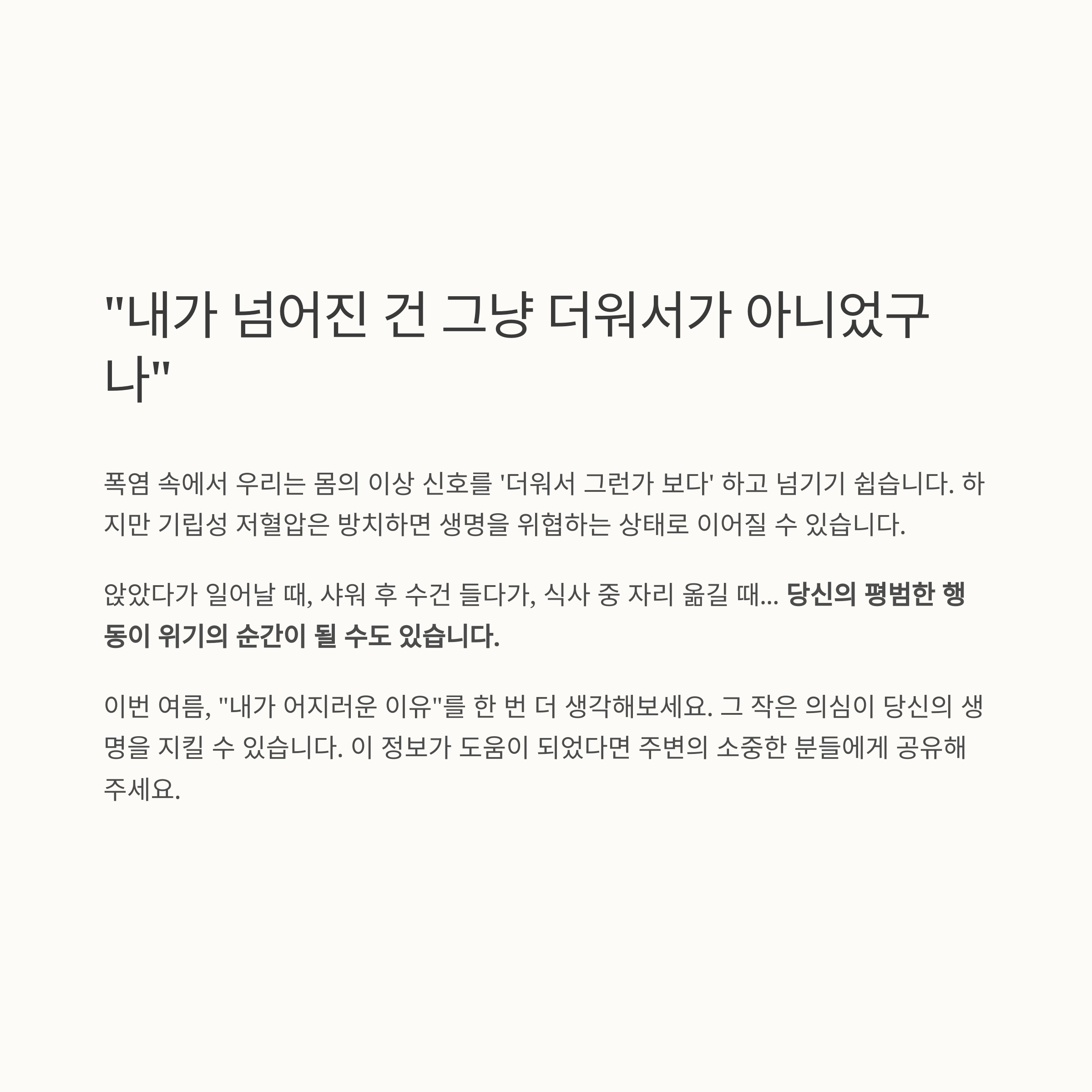 폭염 속에서 우리는 몸의 이상 신호를 ‘더워서 그런가 보다’ 하고 넘기기 쉽습니다.