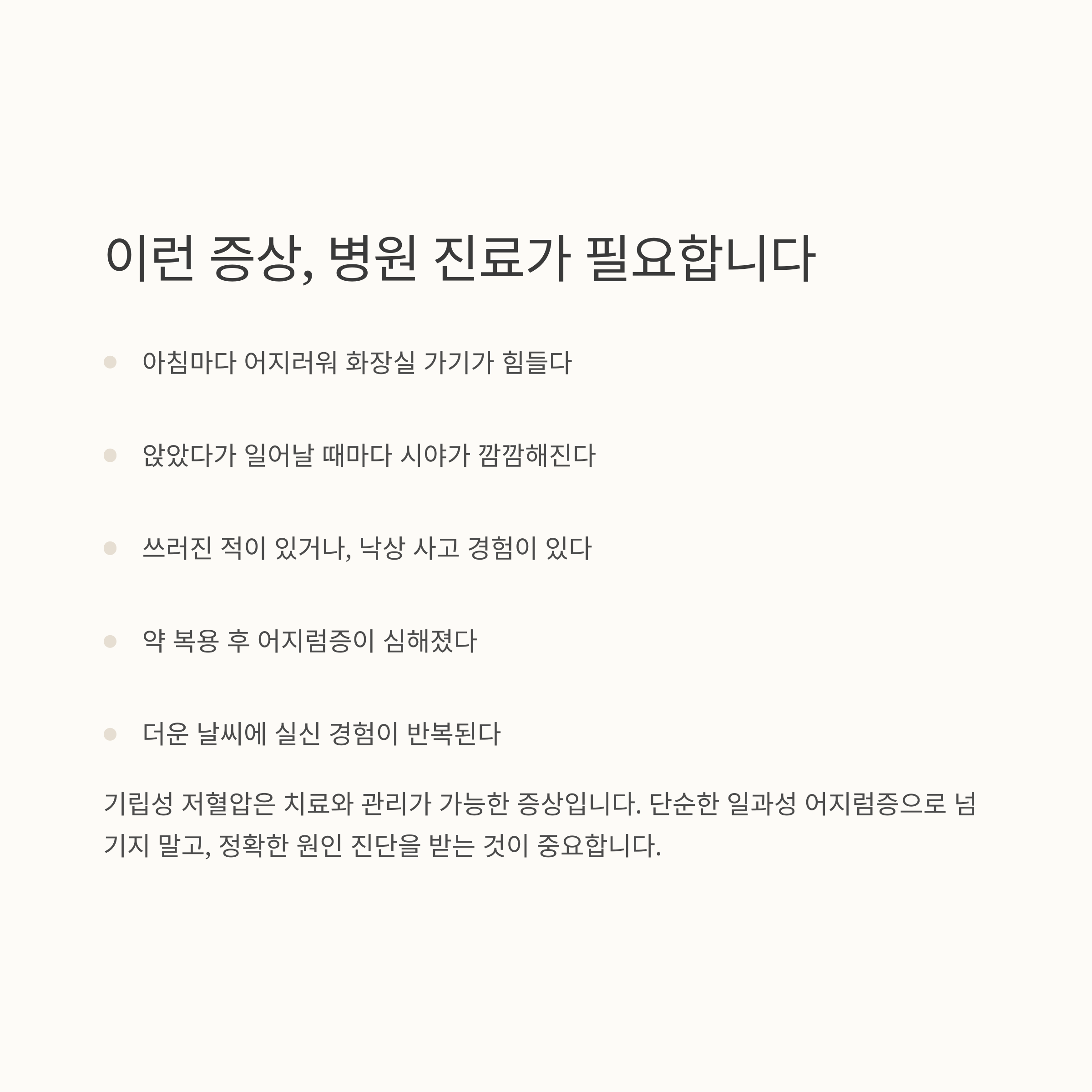 기립성 저혈압은 치료와 관리가 가능한 증상입니다.