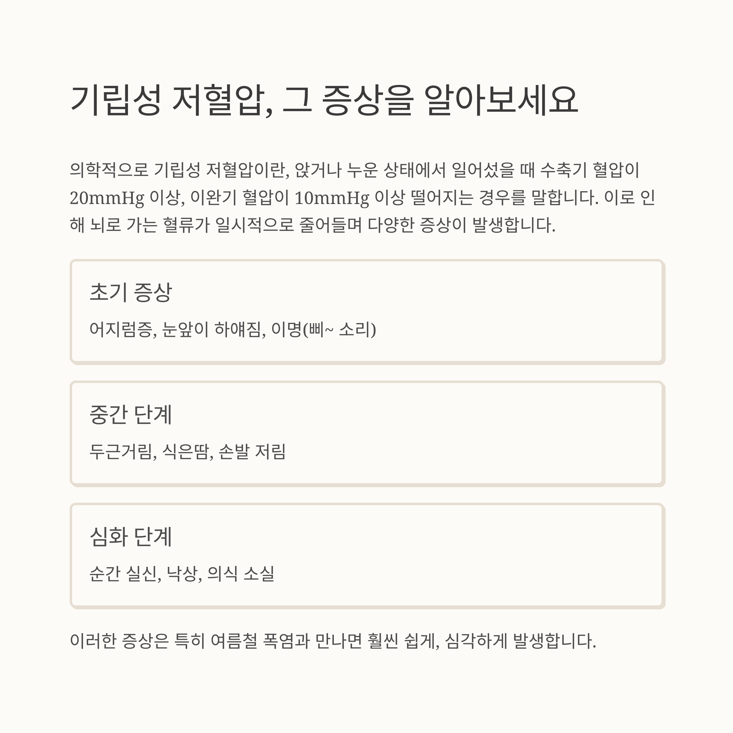 폭염 속 “순간 어지러워서 휘청거렸다”는 경험, 한 번쯤 있으셨을 겁니다. 하지만 그게 단순한 더위 때문이라고만 생각하셨다면 큰 착각입니다. 특히 여름철에는 ‘기립성 저혈압’이라는 위험한 증상이 더 자주, 더 심하게 나타납니다. 고령자나 저체중자뿐 아니라 젊은 층도 탈수, 피로, 더위에 의해 갑작스레 쓰러지는 사고가 잦아지고 있습니다. 이번 글에서는 기립성 저혈압이 무엇인지, 왜 여름에 위험한지, 그리고 실제 실신 사례와 대처법까지 정확하고 현실적으로 풀어드립니다.