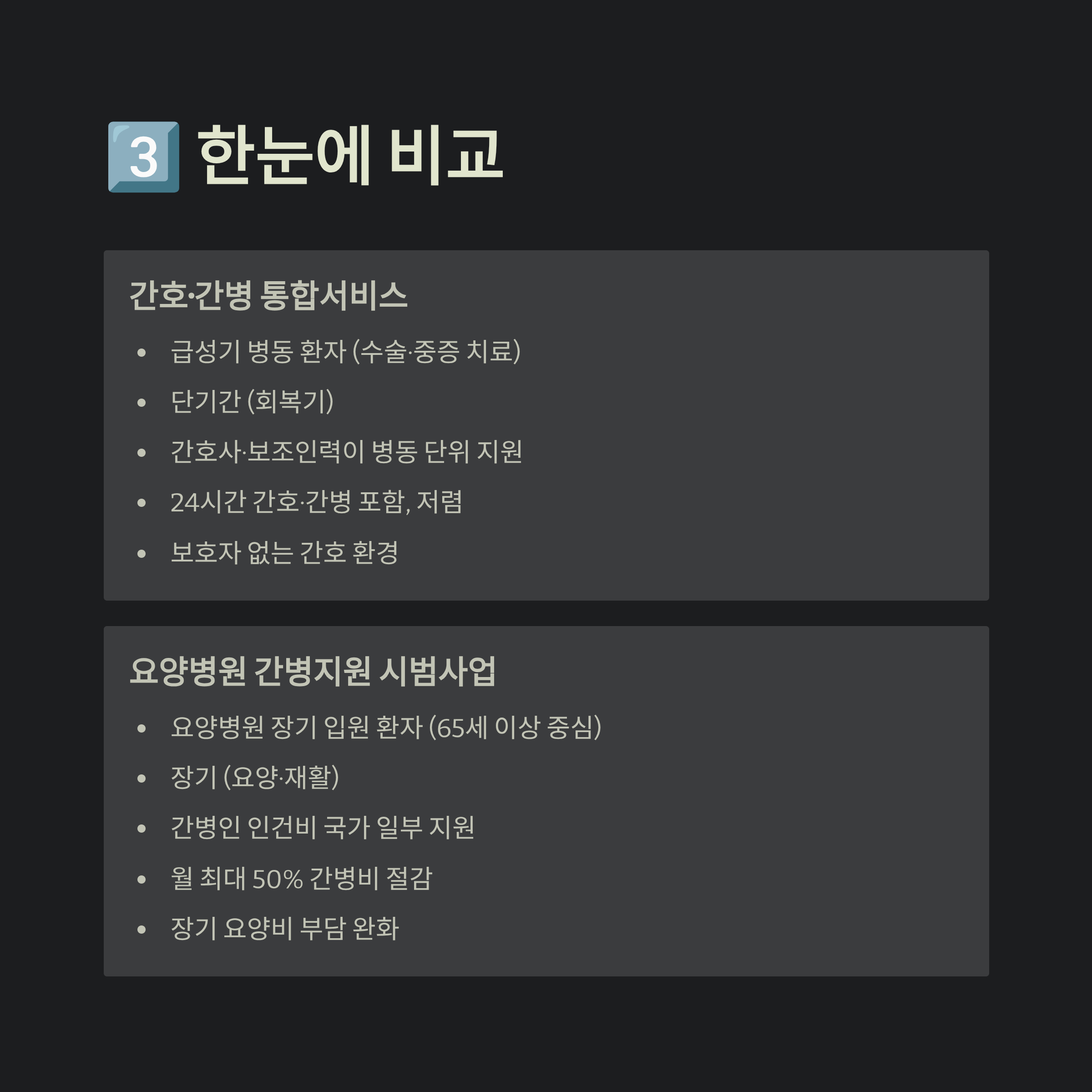 👉 **짧고 집중적인 치료는 ‘간호·간병 통합서비스’, 장기 요양은 ‘간병지원 시범사업’**이라고 기억하시면 쉽습니다.