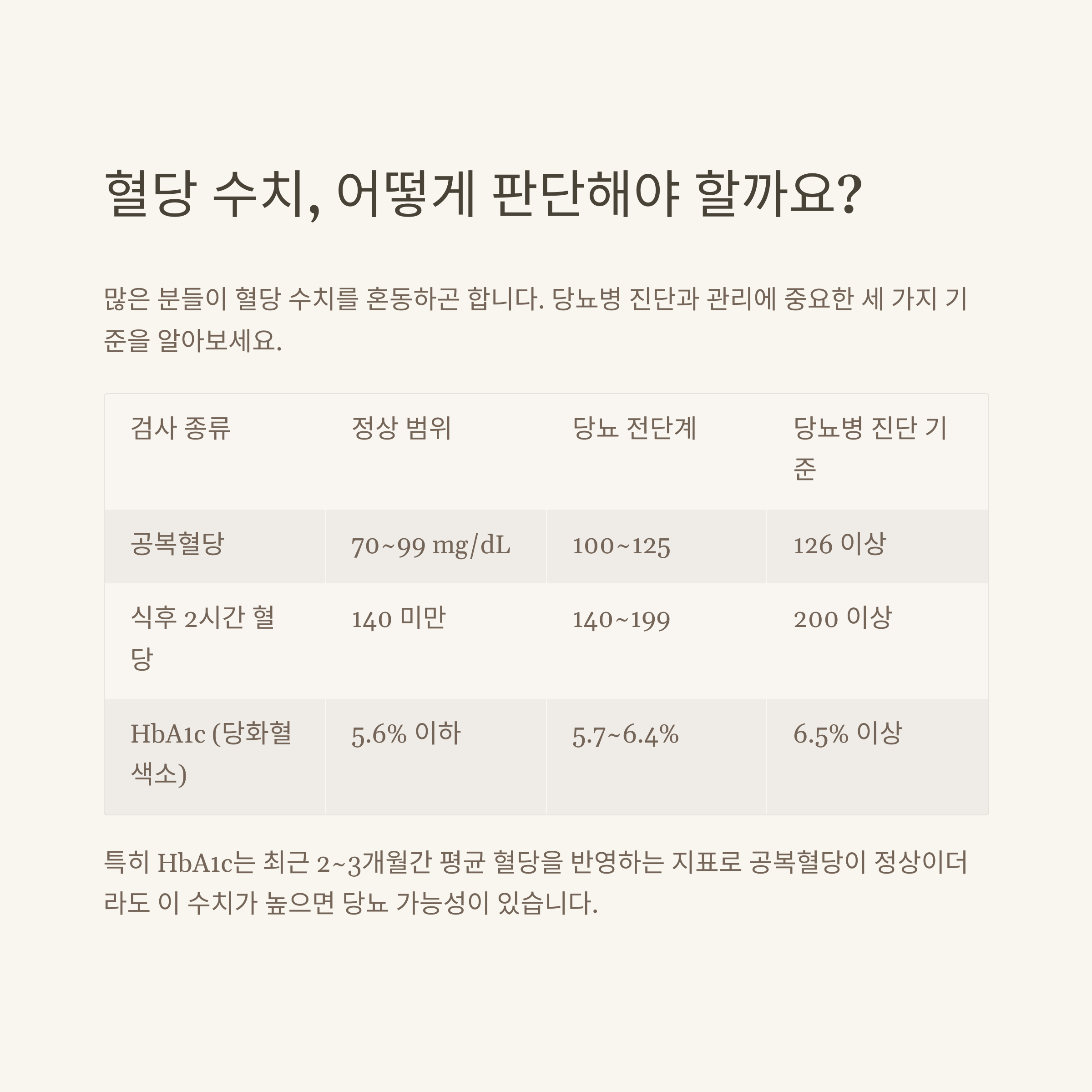 HbA1c (당화혈색소) 5.6% 이하 5.7~6.4% 6.5% 이상