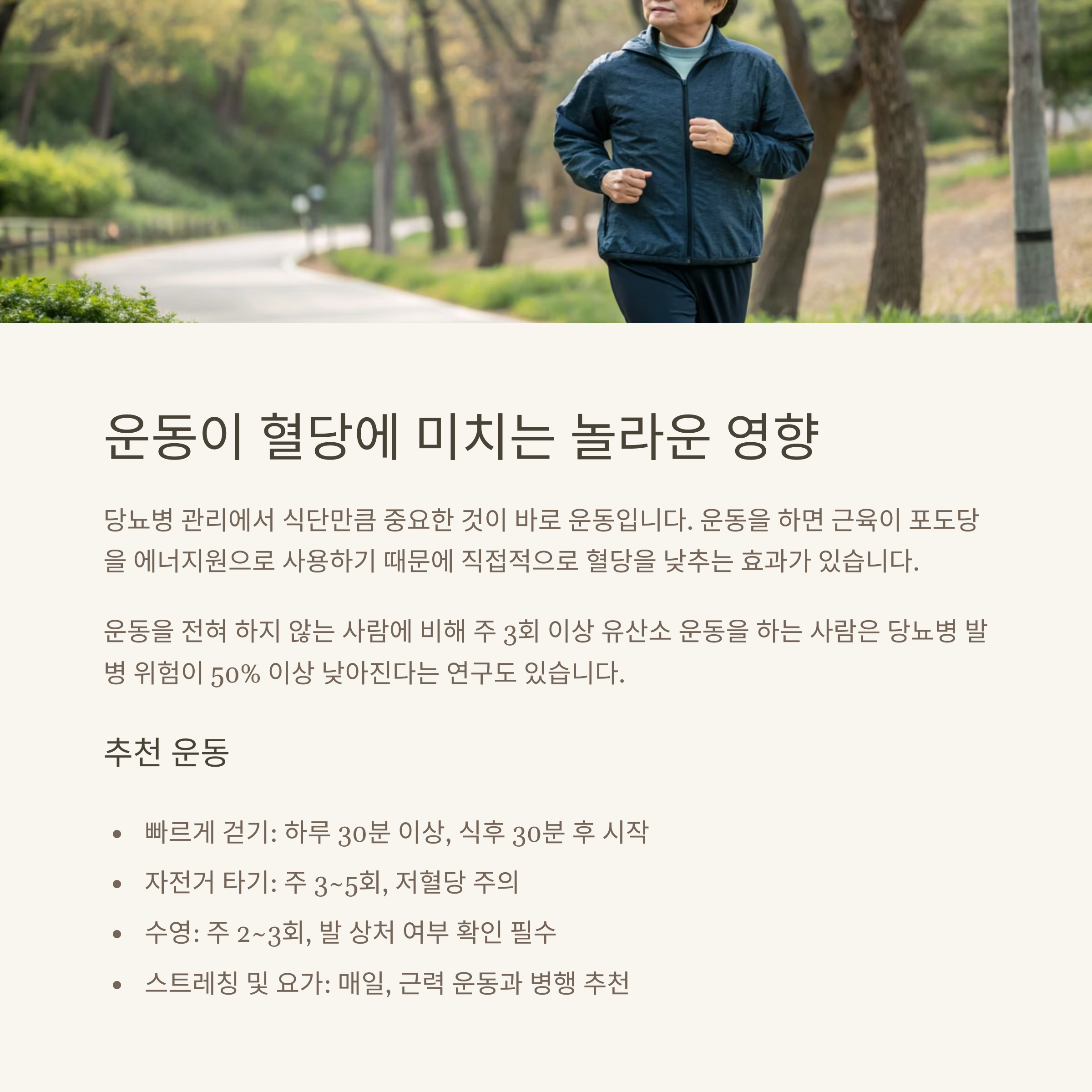 | 자전거 타기 | 주 3~5회 | 저혈당 주의 |