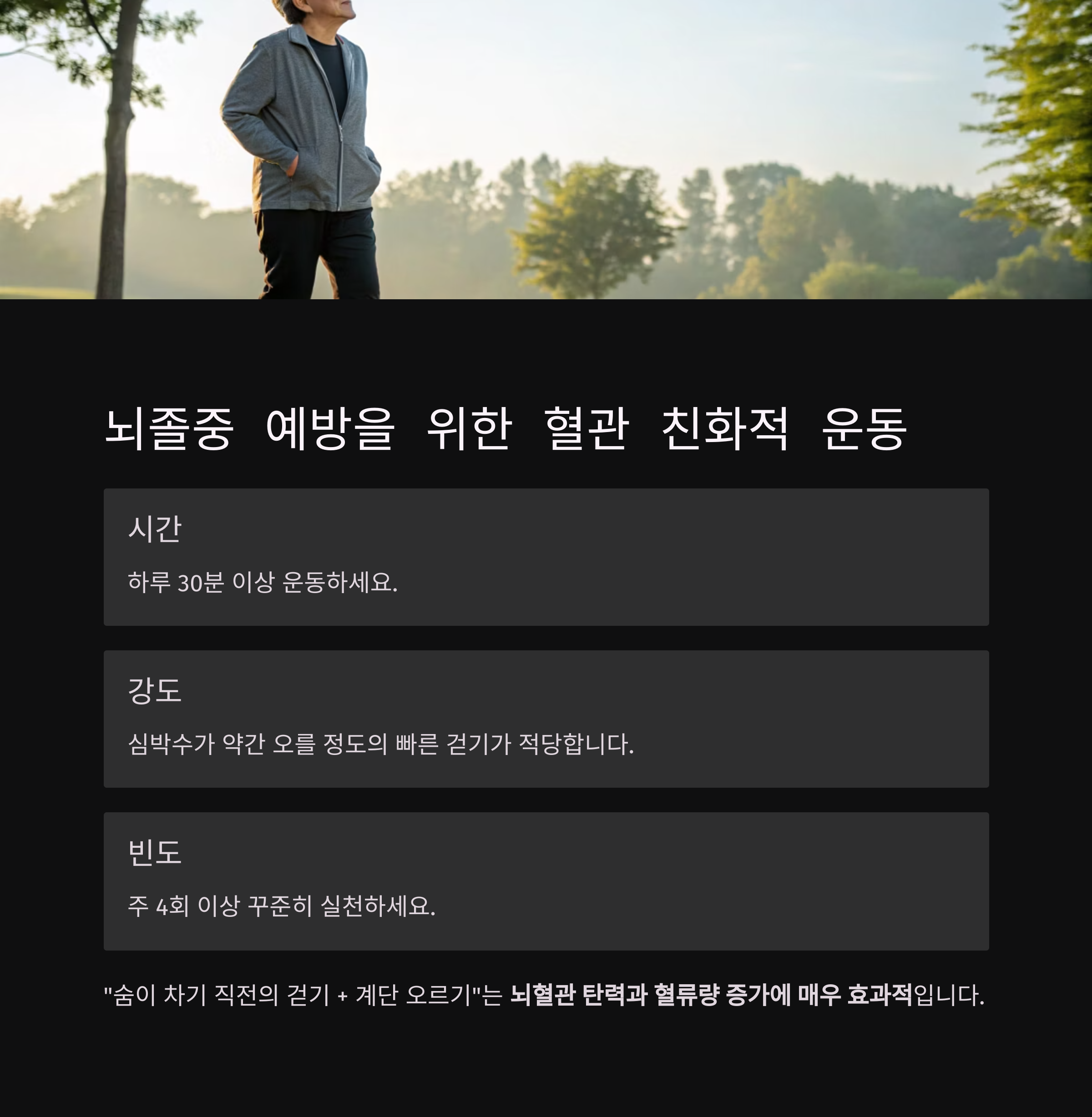 "숨이 차기 직전의 걷기 + 계단 오르기"는 뇌혈관 탄력과 혈류량 증가에 매우 효과적입니다.