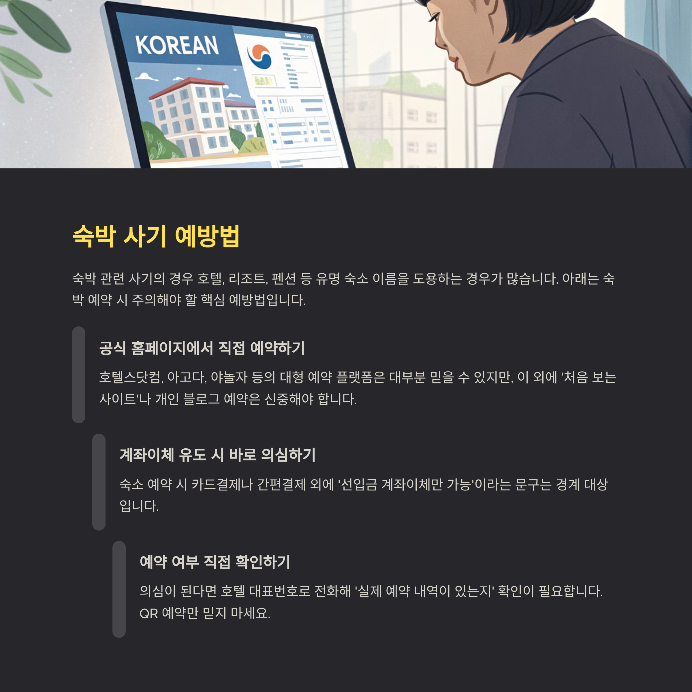 아래는 숙박 예약 시 주의해야 할 핵심 예방법입니다.