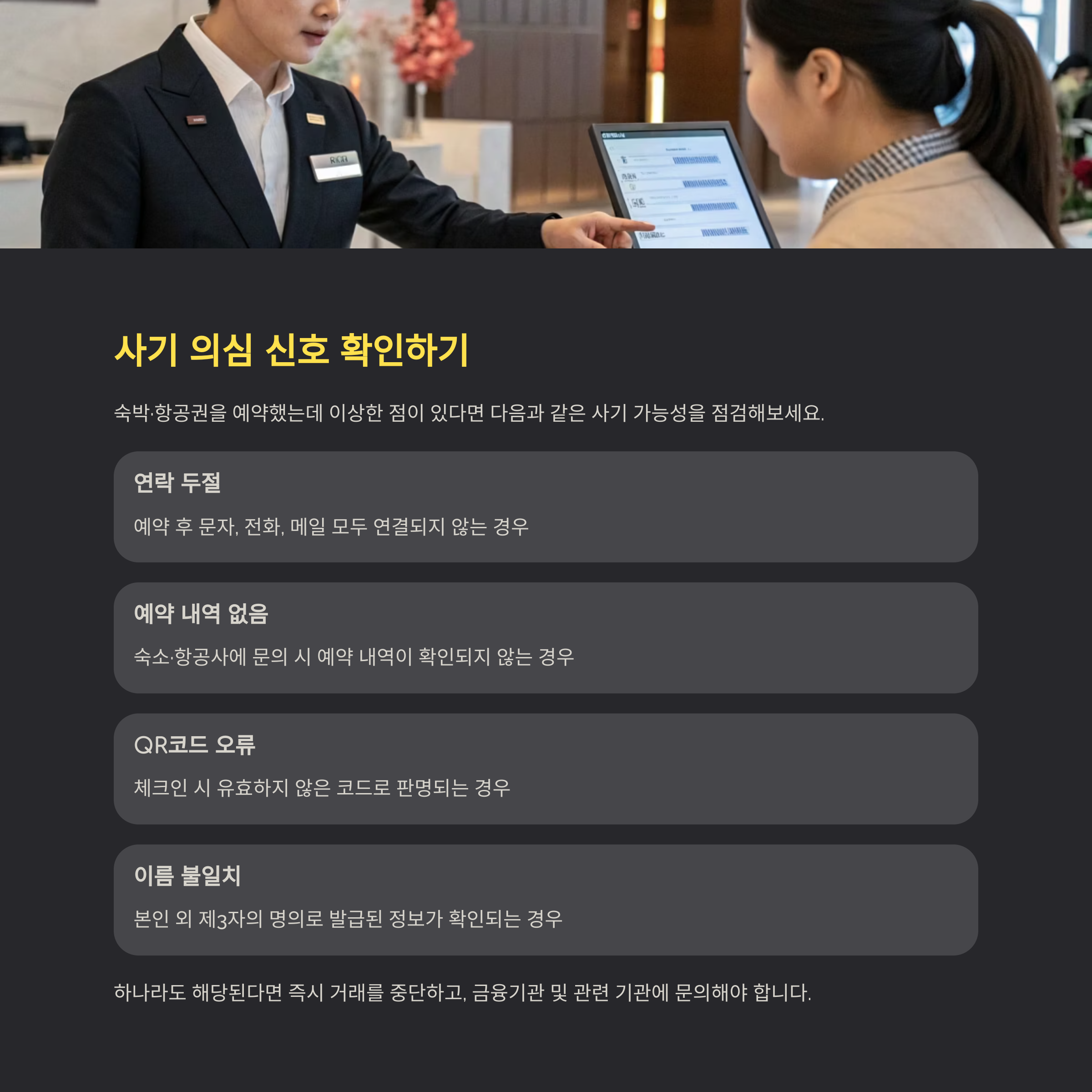 | 숙소·항공사에 문의 시 예약 내역 없음 | 사설 사이트에서 예약된 내역 미확인 |