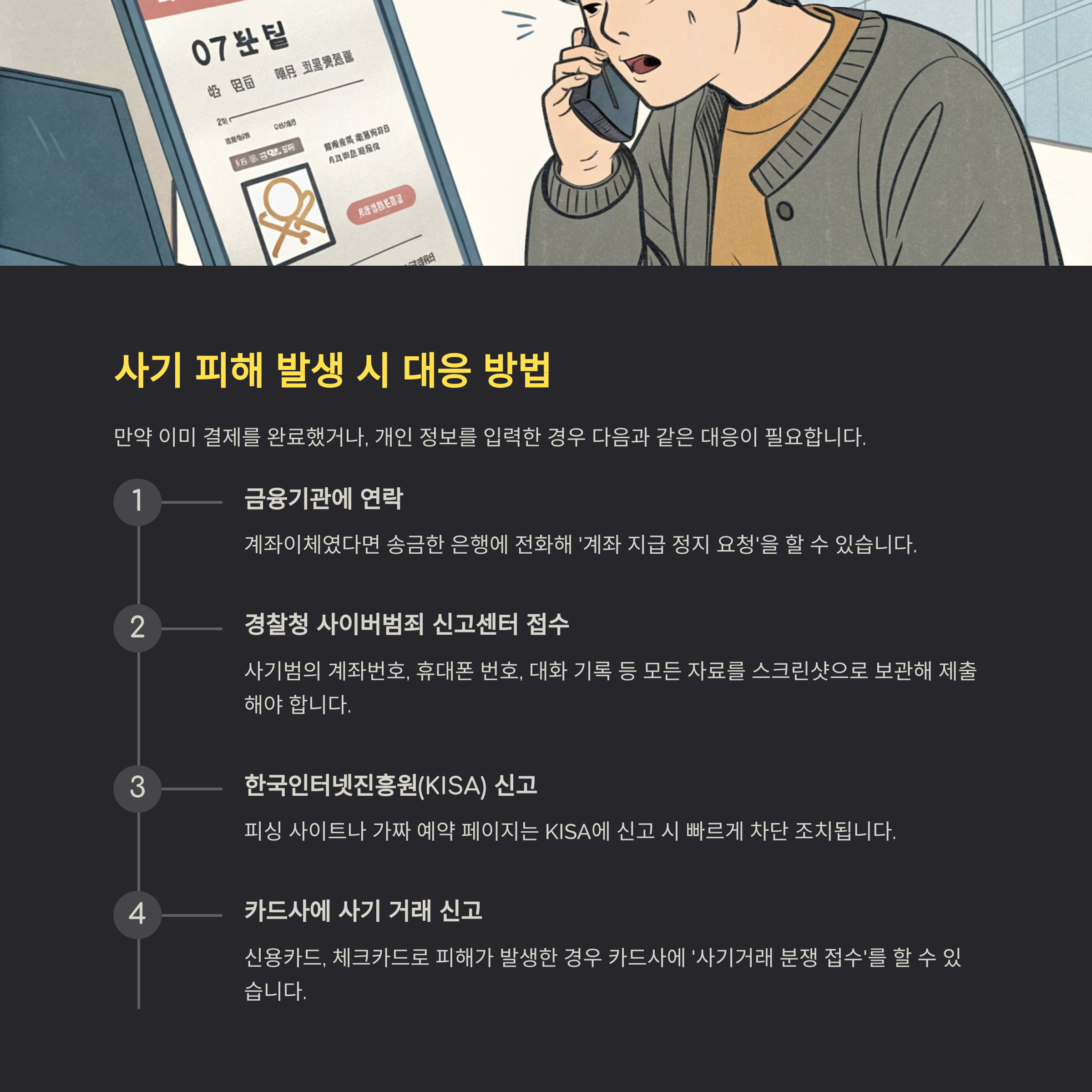 KISA에 신고 시 빠르게 차단 조치됩니다. - 카드사에 사기 거래 신고 요청