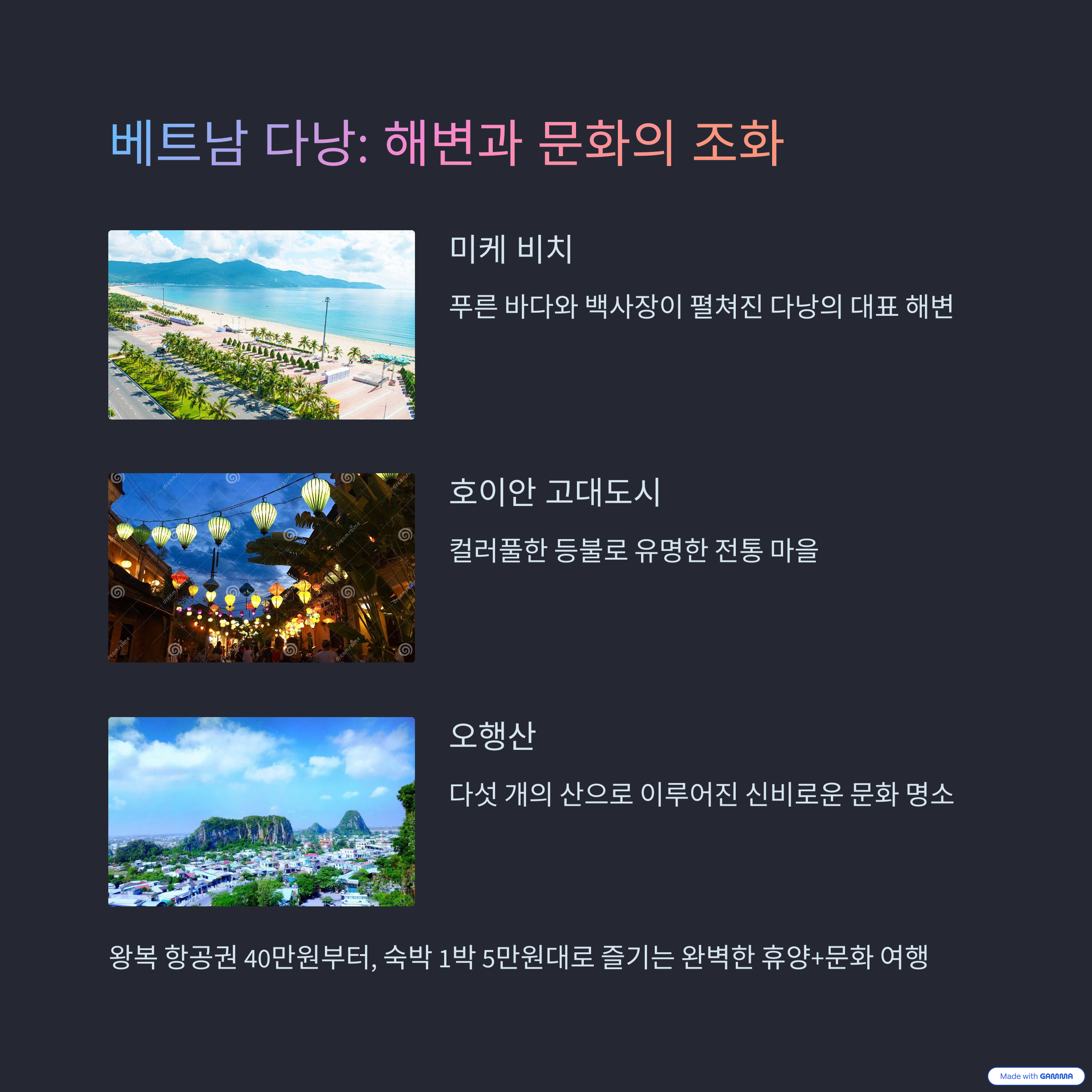 - 다낭: 미케 해변과 바나힐 등 볼거리 많고, 물가 저렴해 숙박과 식사 모두 경제적임.