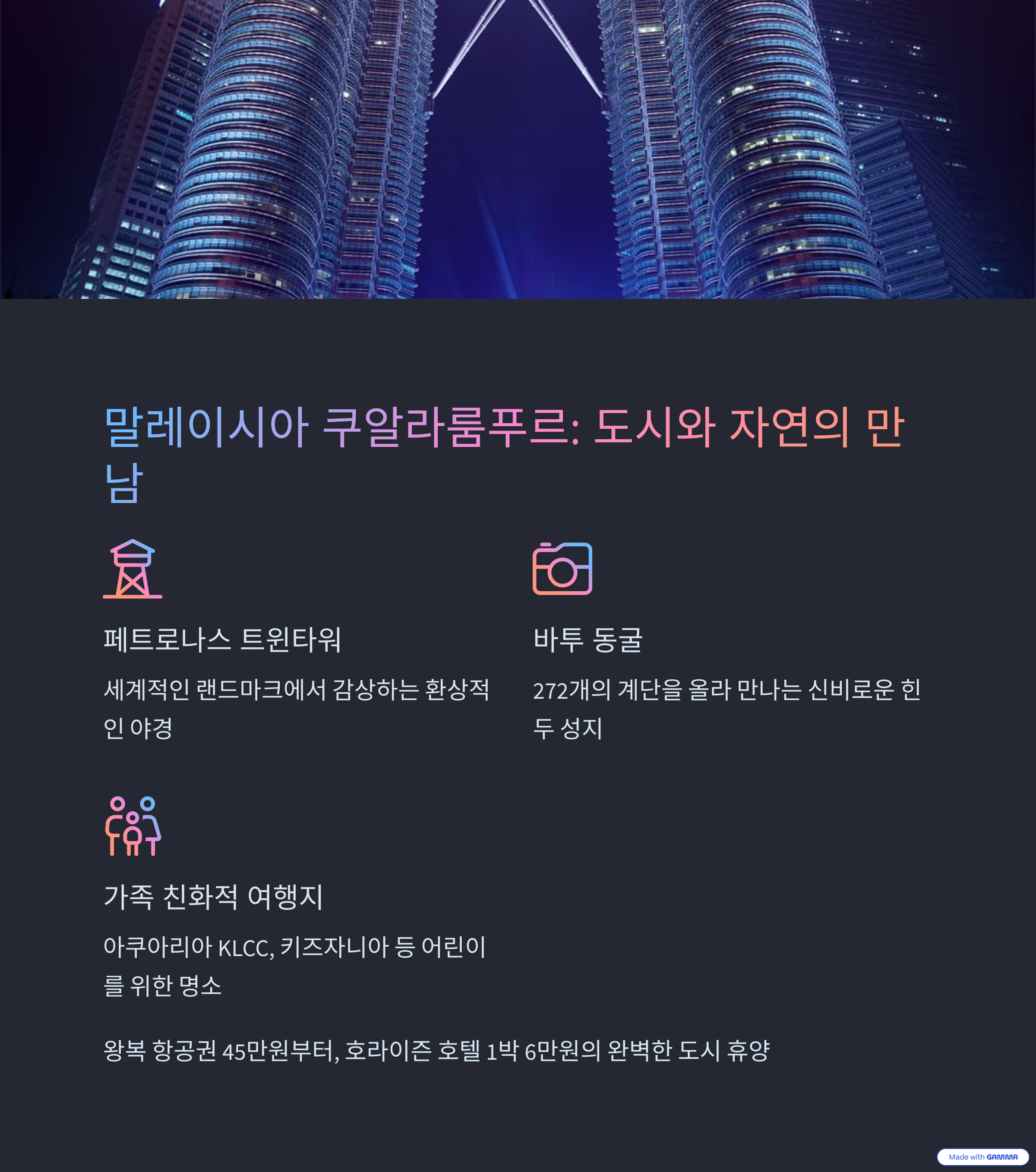 - 쿠알라룸푸르: 이슬람 건축과 다양한 민족 음식 체험이 가능하며, 저렴한 항공+호텔 패키지 많음.