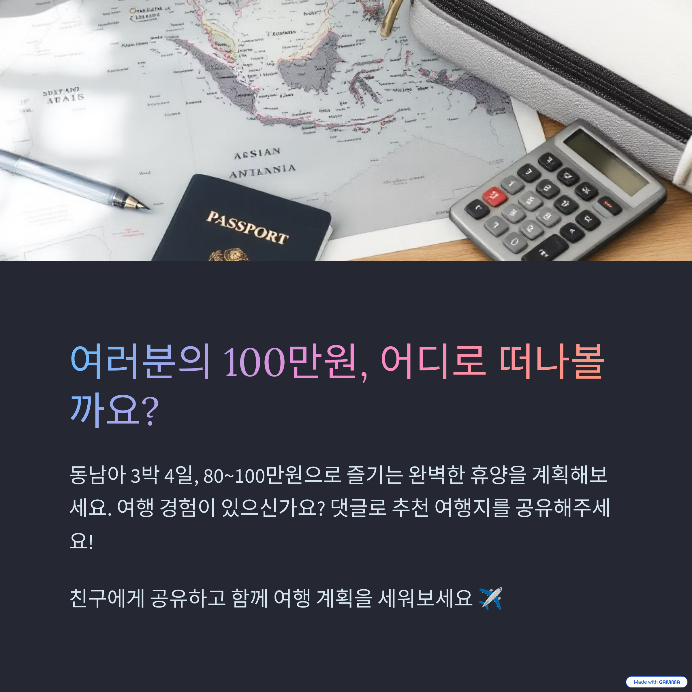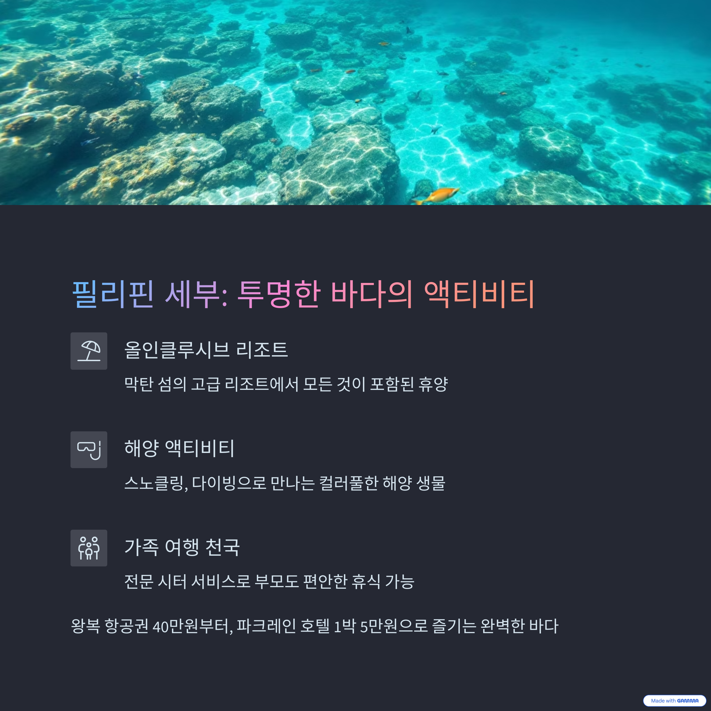 - 세부: 바다 액티비티 중심의 일정 구성 가능하며, 여행 비용 대비 만족도 높음.