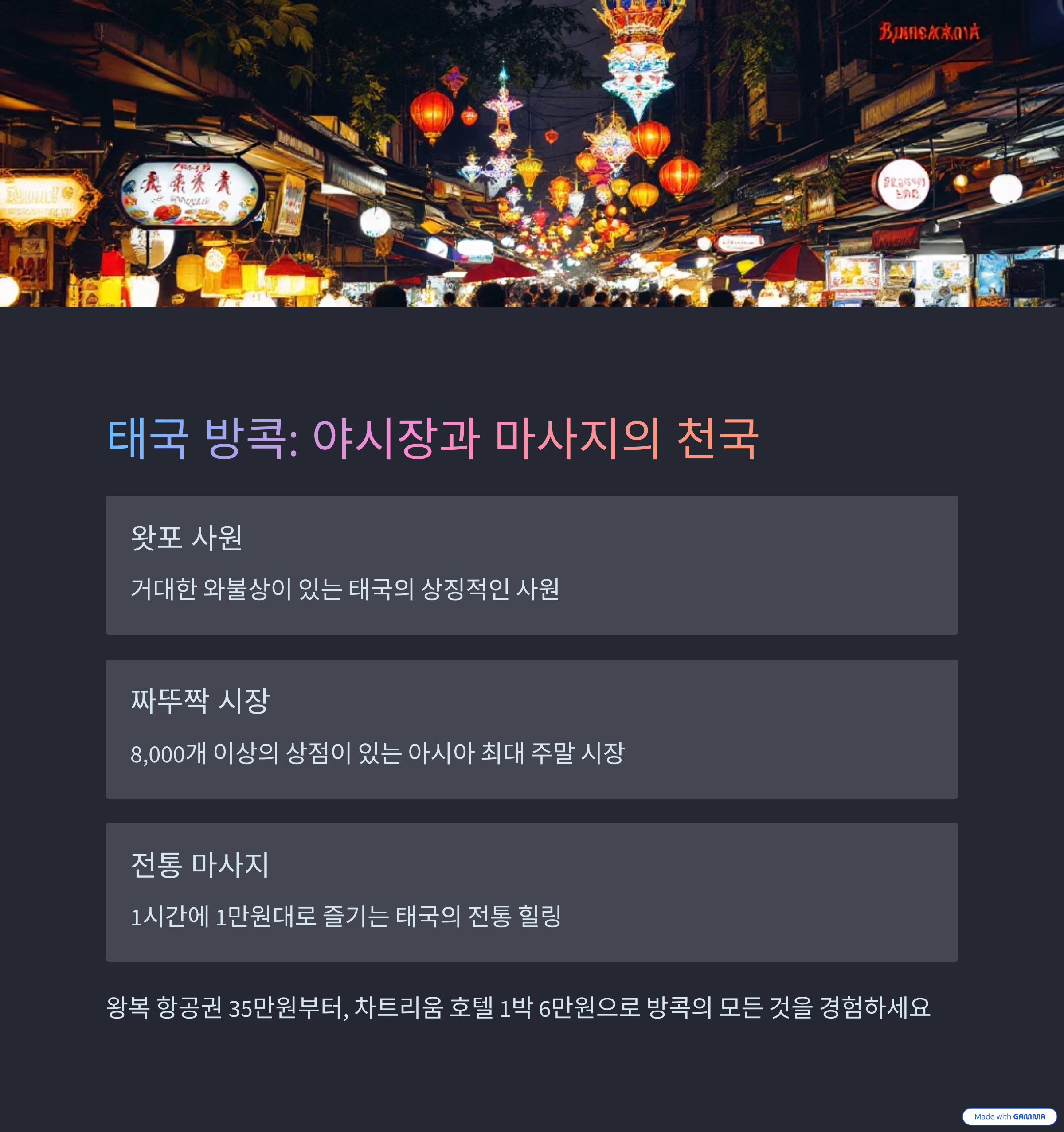 - 방콕: 길거리 음식과 마사지, 왕궁 투어까지 다양한 경험이 가능하며 항공권도 저렴한 편.