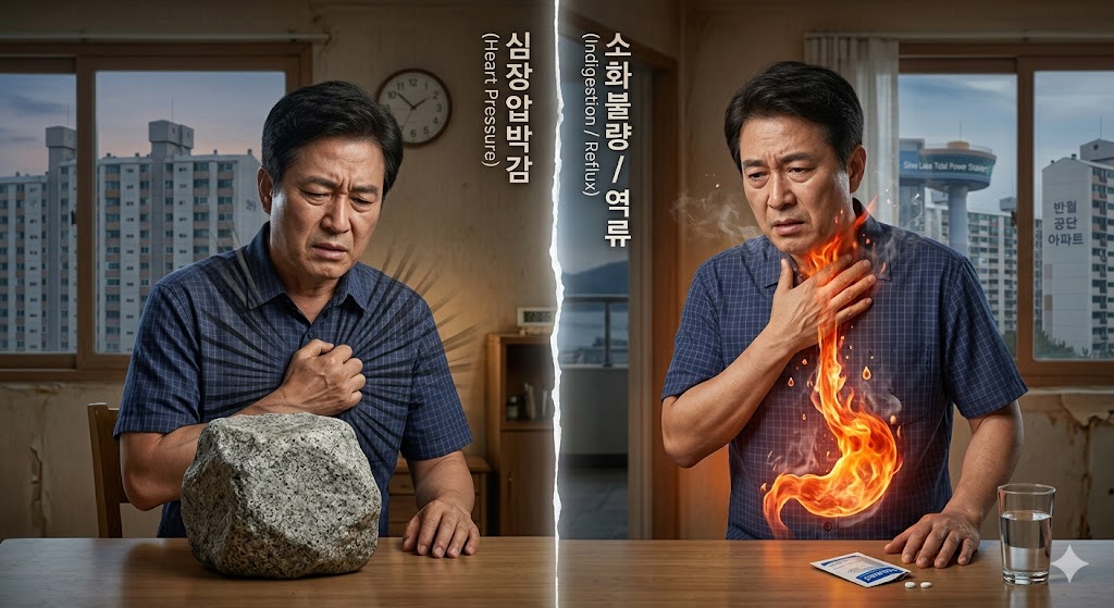 | 구분 항목 | 심장 질환 (협심증/심근경색) | 소화기 질환 (소화불량/역류성 식도염) |