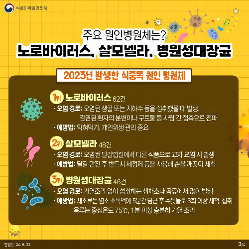 노로바이러스는 2023년 가장 많은 식중독 사례의 원인이 된 병원체로, 62건의 사례를 기록했습니다. 주로 오염된 생굴이나 지하수를 섭취할 때 감염되며, 감염된 환자의 분변이나 구토물과의 접촉으로도 쉽게 전파됩니다.- 예방법: 생굴을 섭취할 때는 반드시 익혀 먹고, 손씻기와 같은 개인 위생 관리에 철저히 신경 써야 합니다.