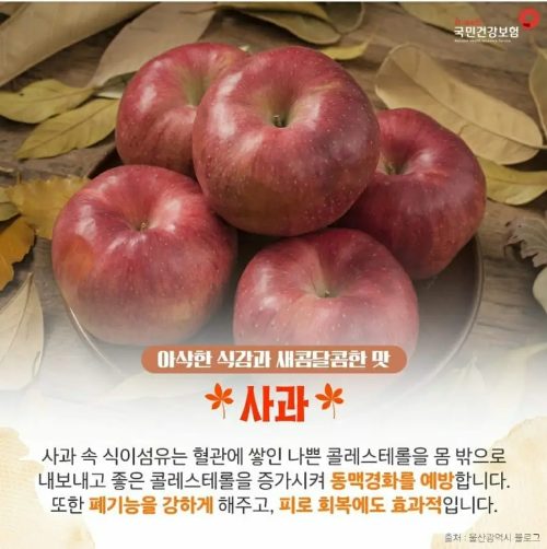 사과는 가을에 더욱 맛있어지는 과일입니다. 특히 식이섬유가 풍부하여 나쁜 콜레스테롤을 배출시키고, 폐 기능 강화에 도움을 줍니다. 사과를 꾸준히 섭취하면 동맥경화 예방과 피로 회복에도 탁월한 효과가 있습니다.