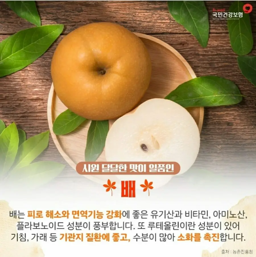배는 그대로 섭취해도 좋고, 주스나 샐러드로 활용할 수도 있습니다. 기관지 건강이 걱정되는 가을철, 배를 자주 먹어보세요.