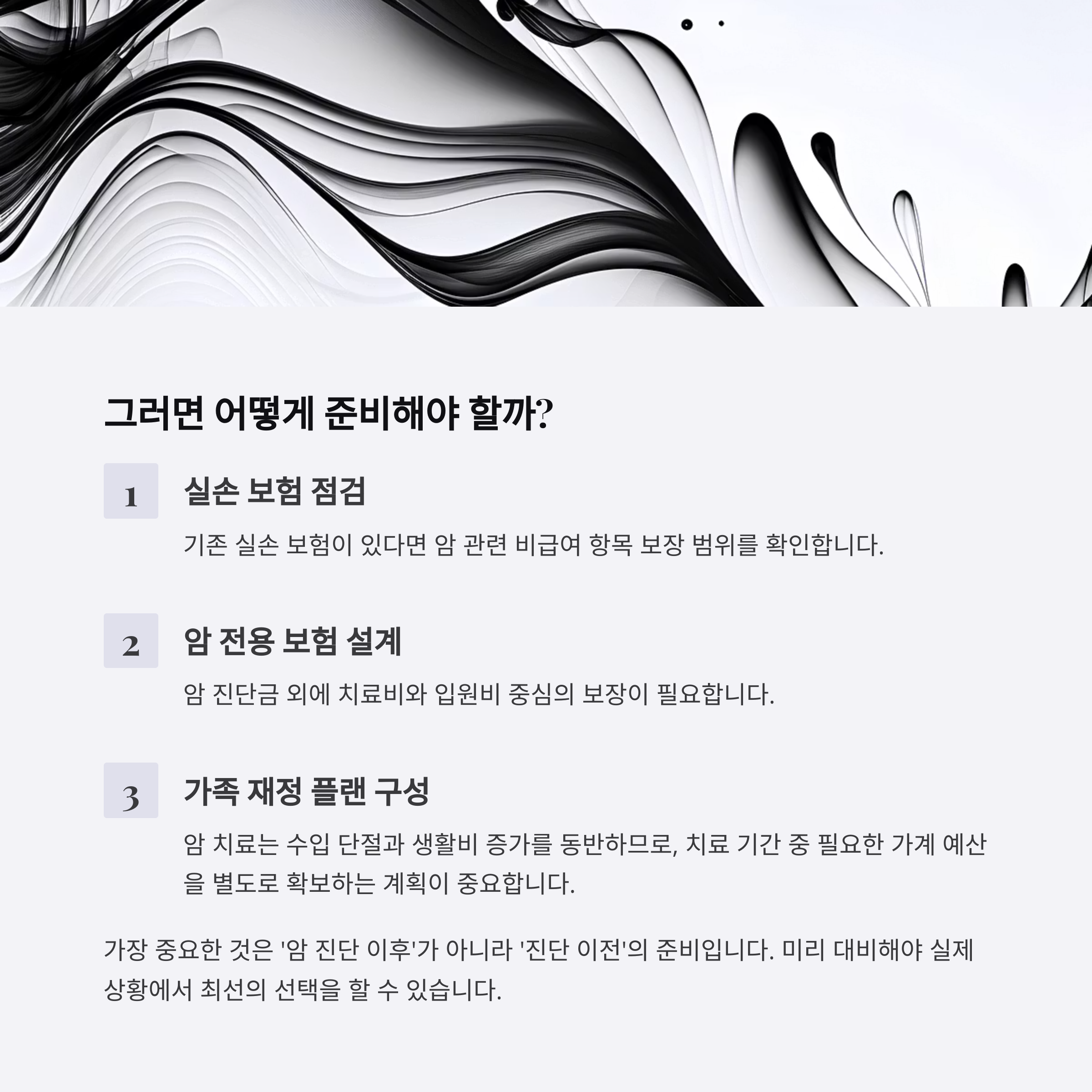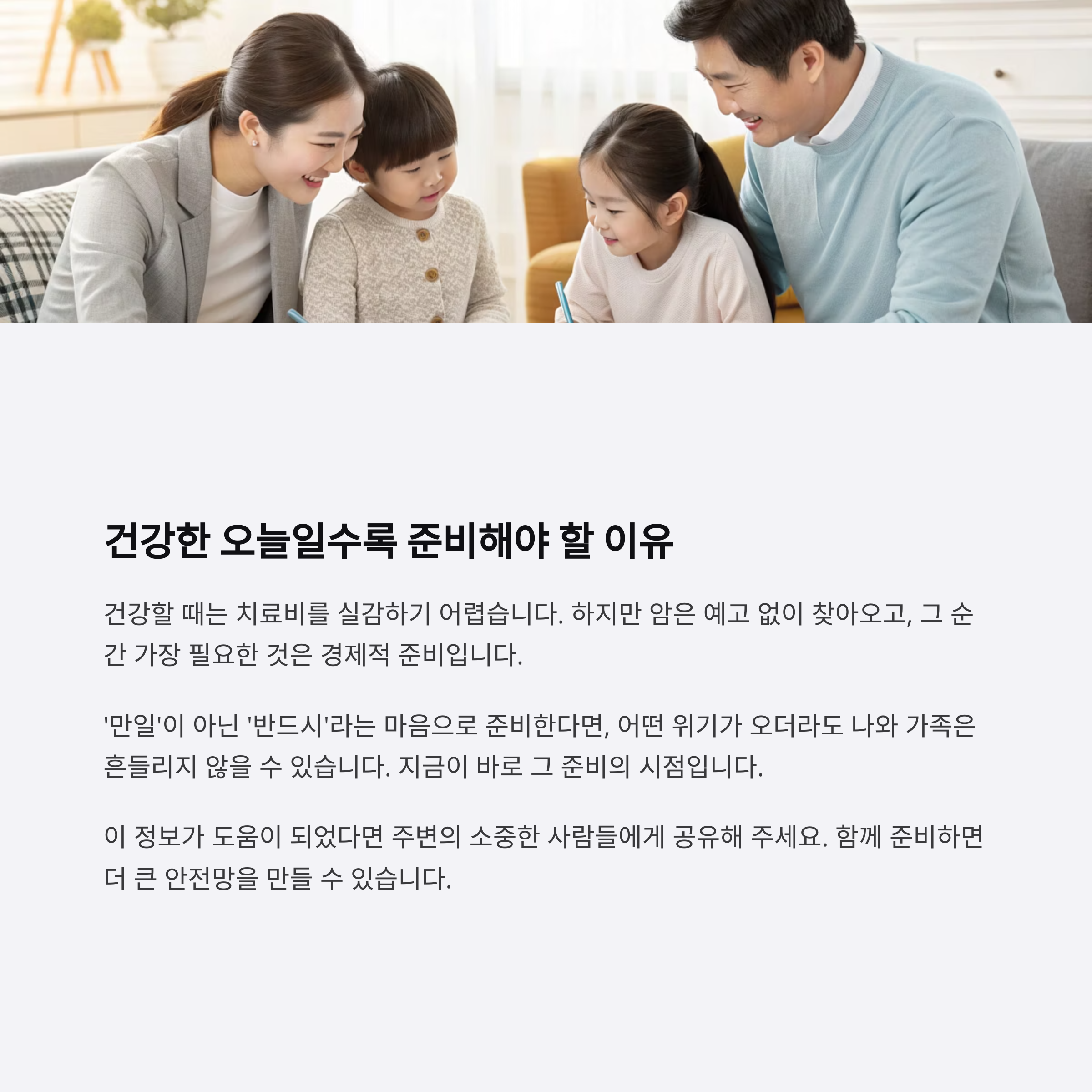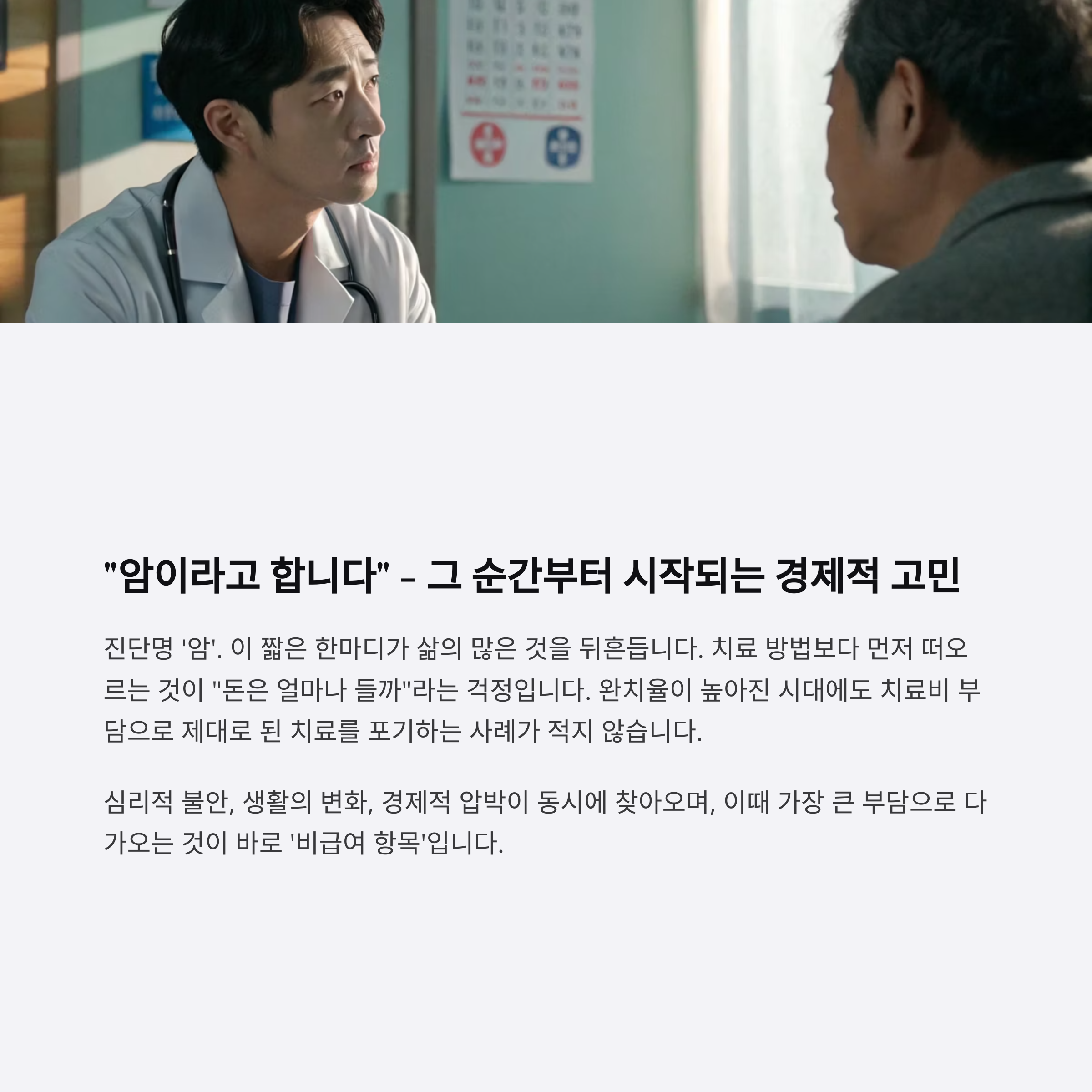 하지만 암은 예고 없이 찾아오고, 그 순간 가장 필요한 것은 경제적 준비입니다.
