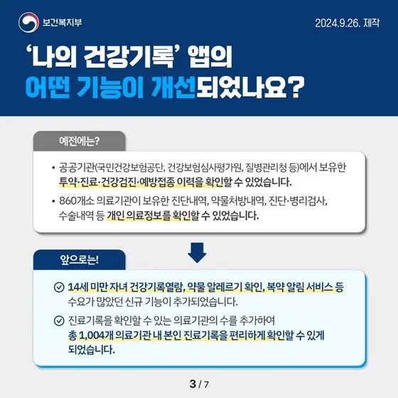 가족의 건강을 관리하는 일이 그 어느 때보다 중요하다는 것입니다. 독창적인 방문 기록을 매일이 관리하는 것이 번거로우셨나요? 바로 그럴 때 필요한 것이 '나의 건강기록' 앱 입니다. 이 앱은 2023년 9월 26일에 기능이 개선되어 서비스로 제공됩니다. 1,004개의 의료 기관과 캐스팅으로 구성된 의료 데이터를 전체적으로 볼 수 있으며, 여러 가지 필수 기능이 추가되었습니다.