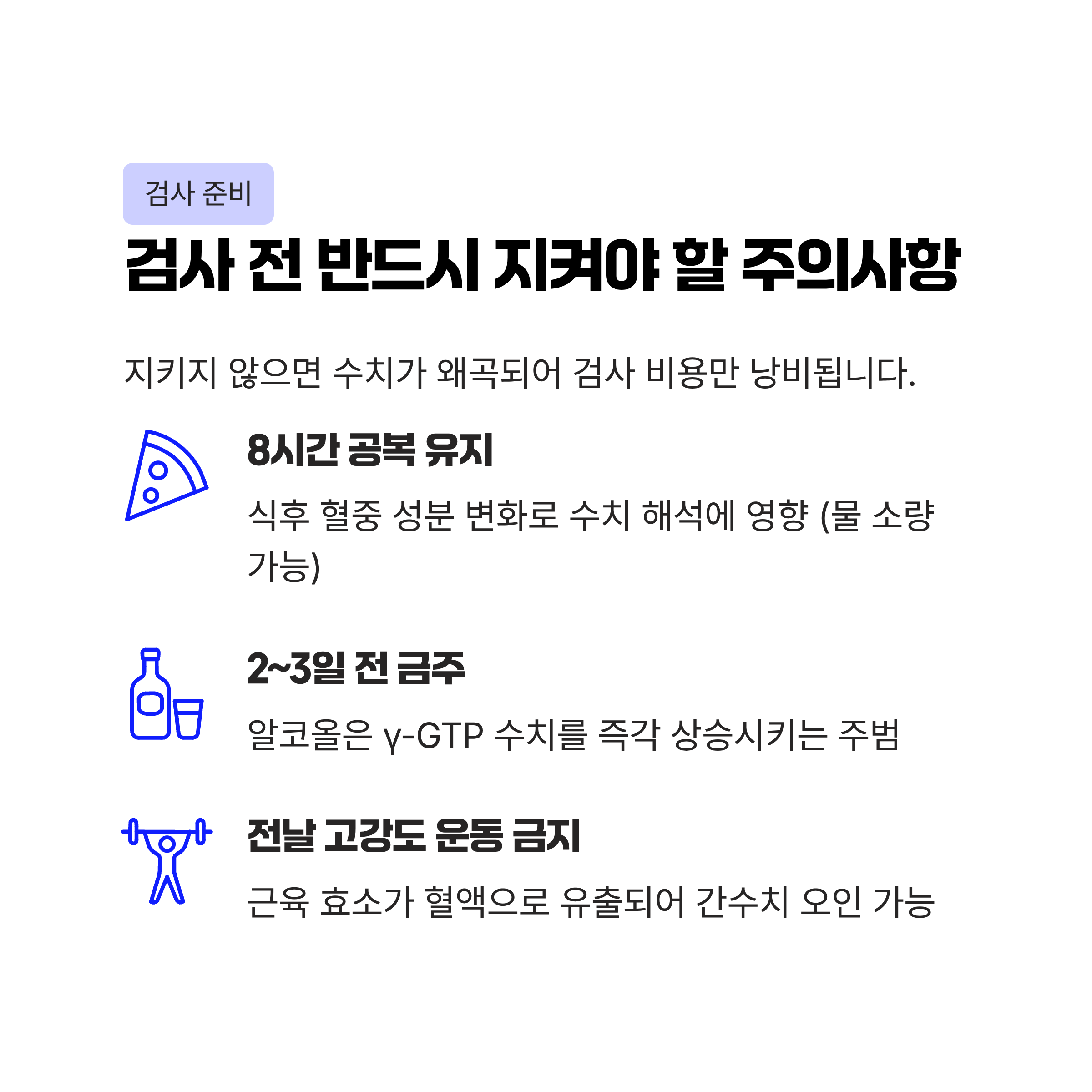 - 검사 전날 고강도 운동 금지: 과격한 근육 운동을 하면 근육 속에 있던 효소가 혈액으로 나와 간수치가 높은 것으로 오인될 수 있습니다.