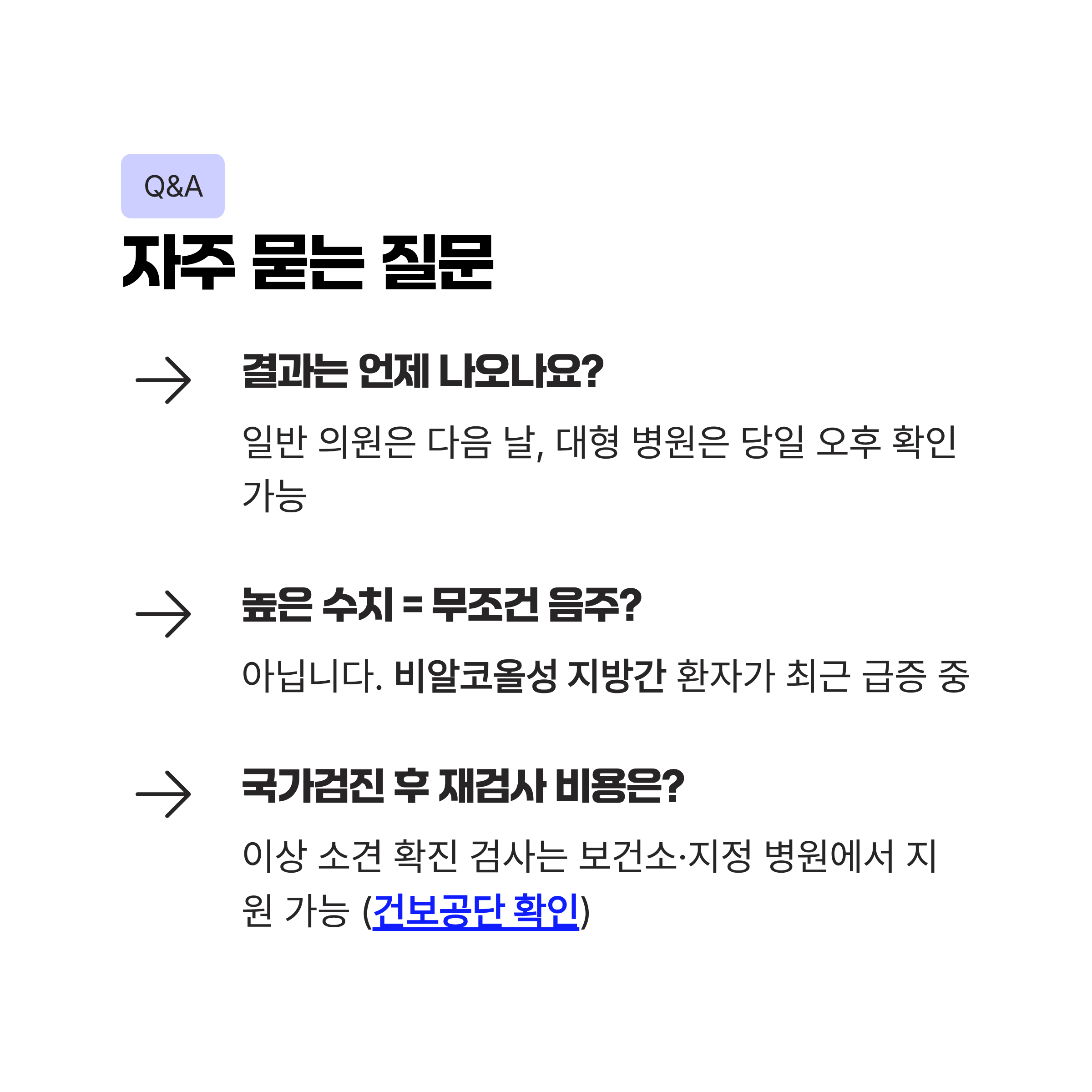 - 검사 항목의 범위: 기본 3종 외에 빌리루빈, 알부민, ALP 등 추가 항목이 늘어날수록 비용이 추가됩니다.