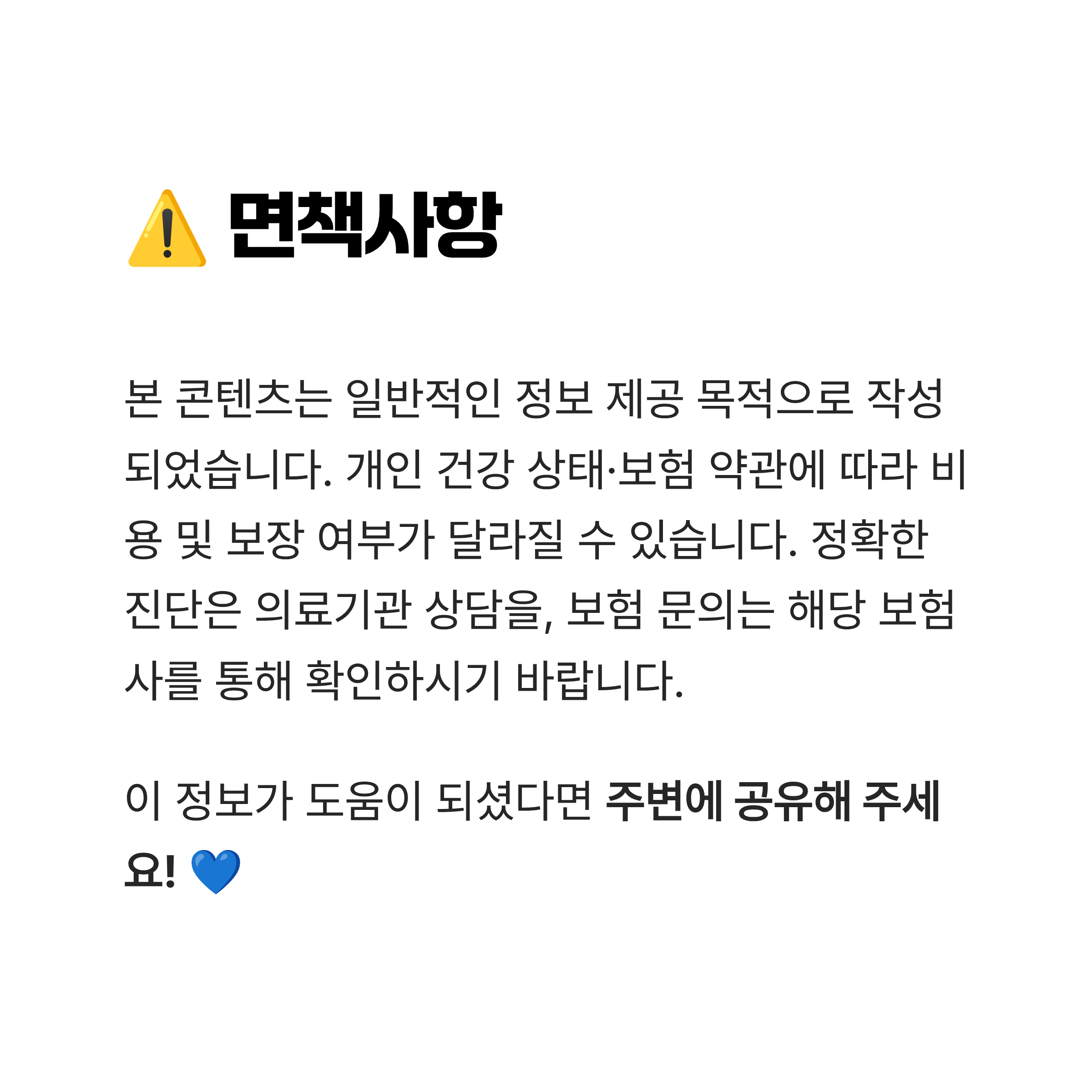 ⚠️ 면책사항: 본 글은 일반적인 정보 제공을 목적으로 작성되었습니다. 개인의 건강 상태나 보험 약관에 따라 비용 및 보장 여부가 달라질 수 있으므로, 정확한 진단은 의료기관 상담을, 보험 관련 문의는 해당 보험사를 통해 확인하시기 바랍니다.