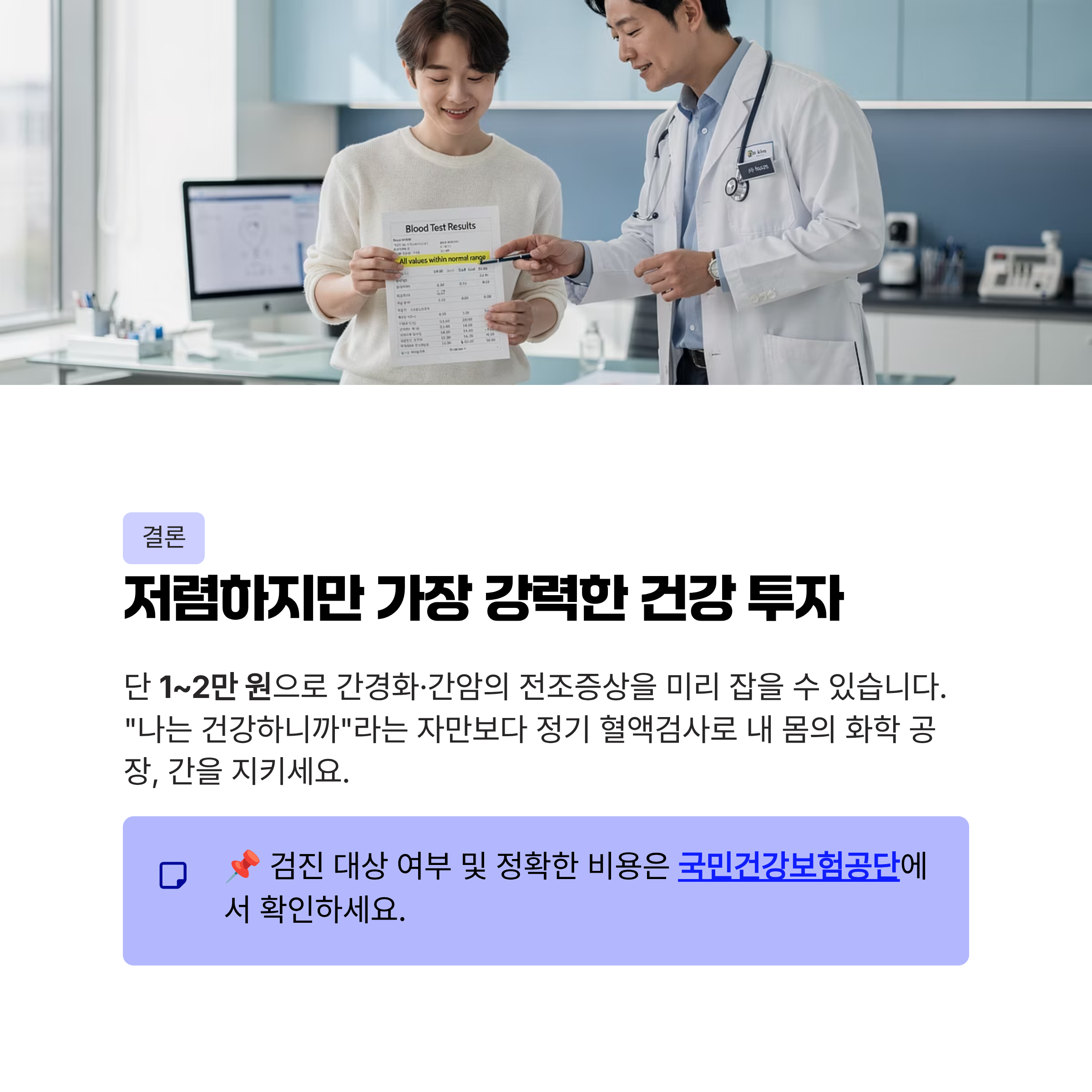 "나는 평소 건강하니까"라고 자만하기보다는, 정기적인 혈액검사를 통해 내 몸의 화학 공장인 간이 잘 작동하고 있는지 확인하시길 바랍니다. 본인의 올해 검진 대상 여부와 정확한 비용은 반드시 공식 홈페이지에서 한 번 더 확인하세요.