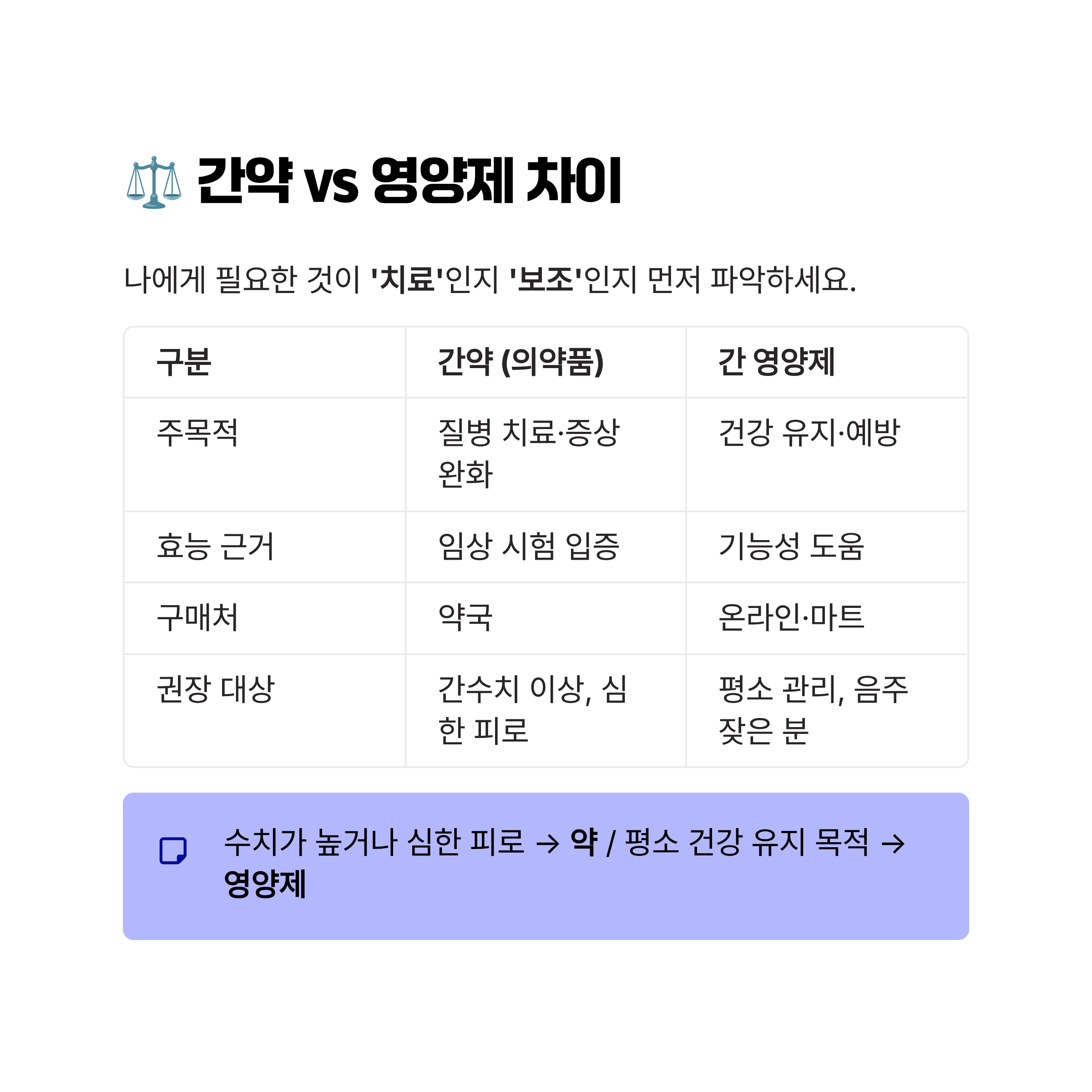 핵심: 이미 수치가 높거나 일상생활이 힘들 정도의 피로가 있다면 '약'을, 평소 건강 유지가 목적이라면 '영양제'를 선택하는 것이 합리적입니다.