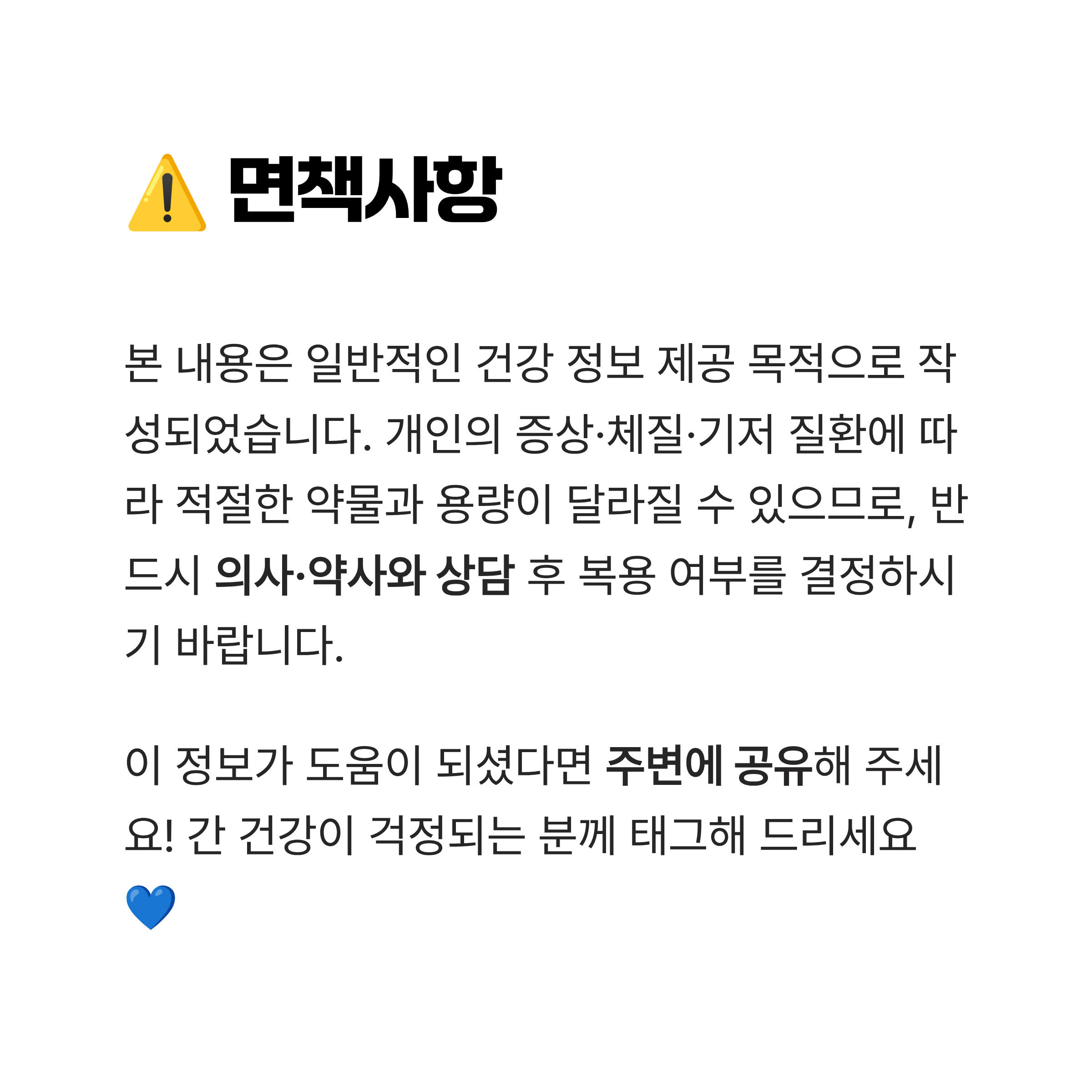- 이미 간 질환(간염 등) 치료 중일 때: 자가 진단은 금물입니다. 반드시 주치의의 처방에 따라 약을 복용해야 합니다.