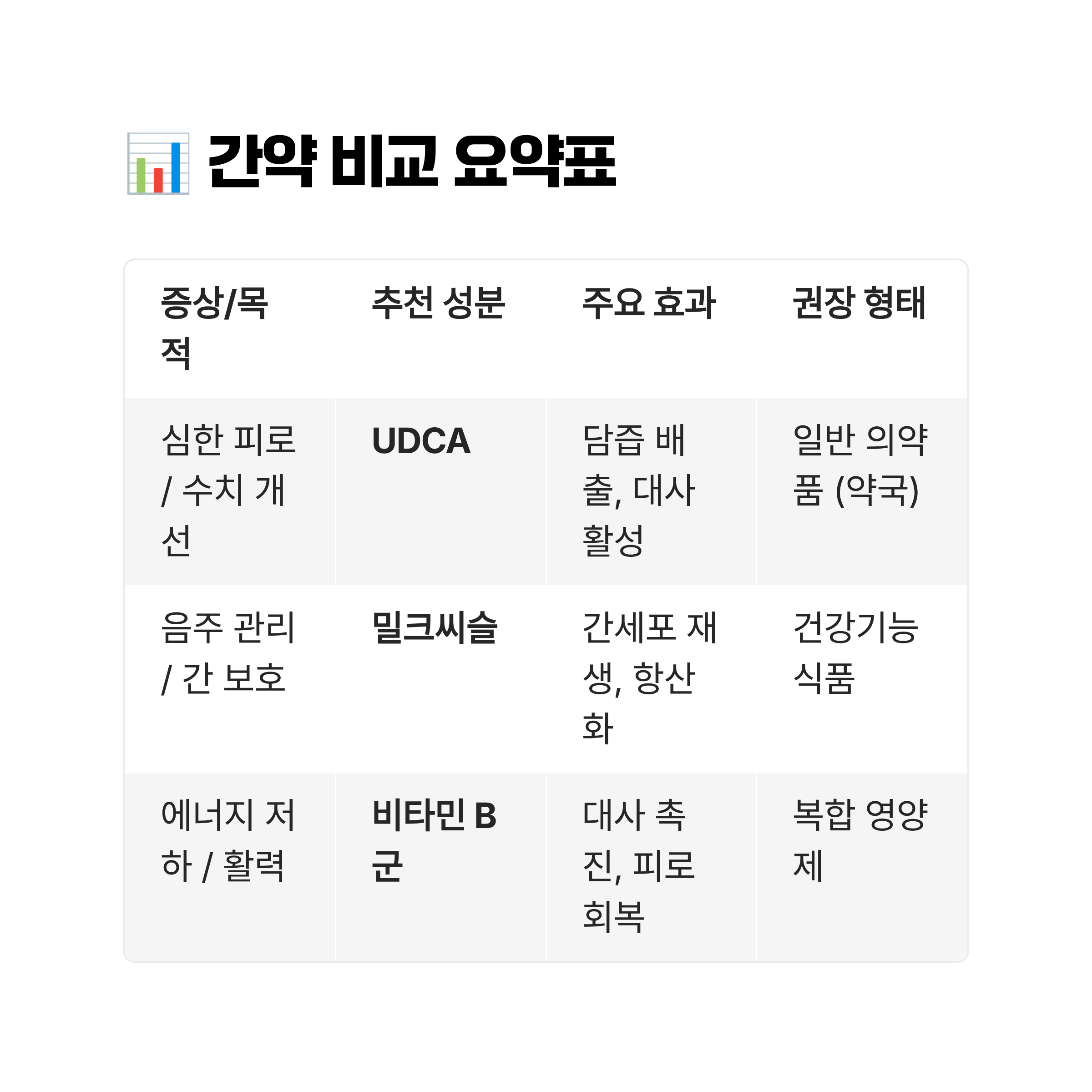 | 심한 피로 / 수치 개선 | UDCA | 담즙 배출, 대사 활성 | 일반 의약품 (약국) |