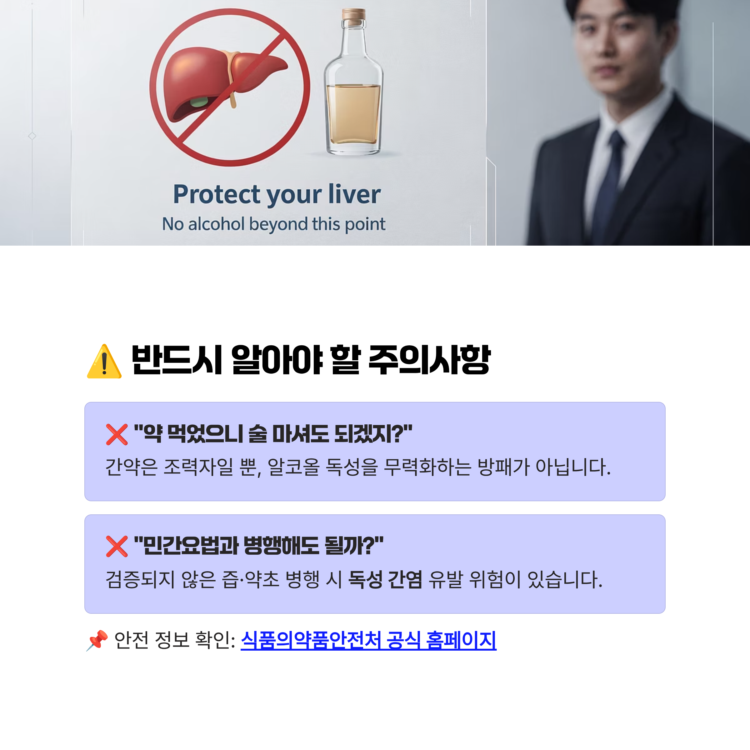- "민간요법과 병행해도 될까?" ❌: 검증되지 않은 즙이나 약초를 간약과 함께 먹으면 오히려 '독성 간염'을 유발하여 간을 마비시킬 수 있습니다.