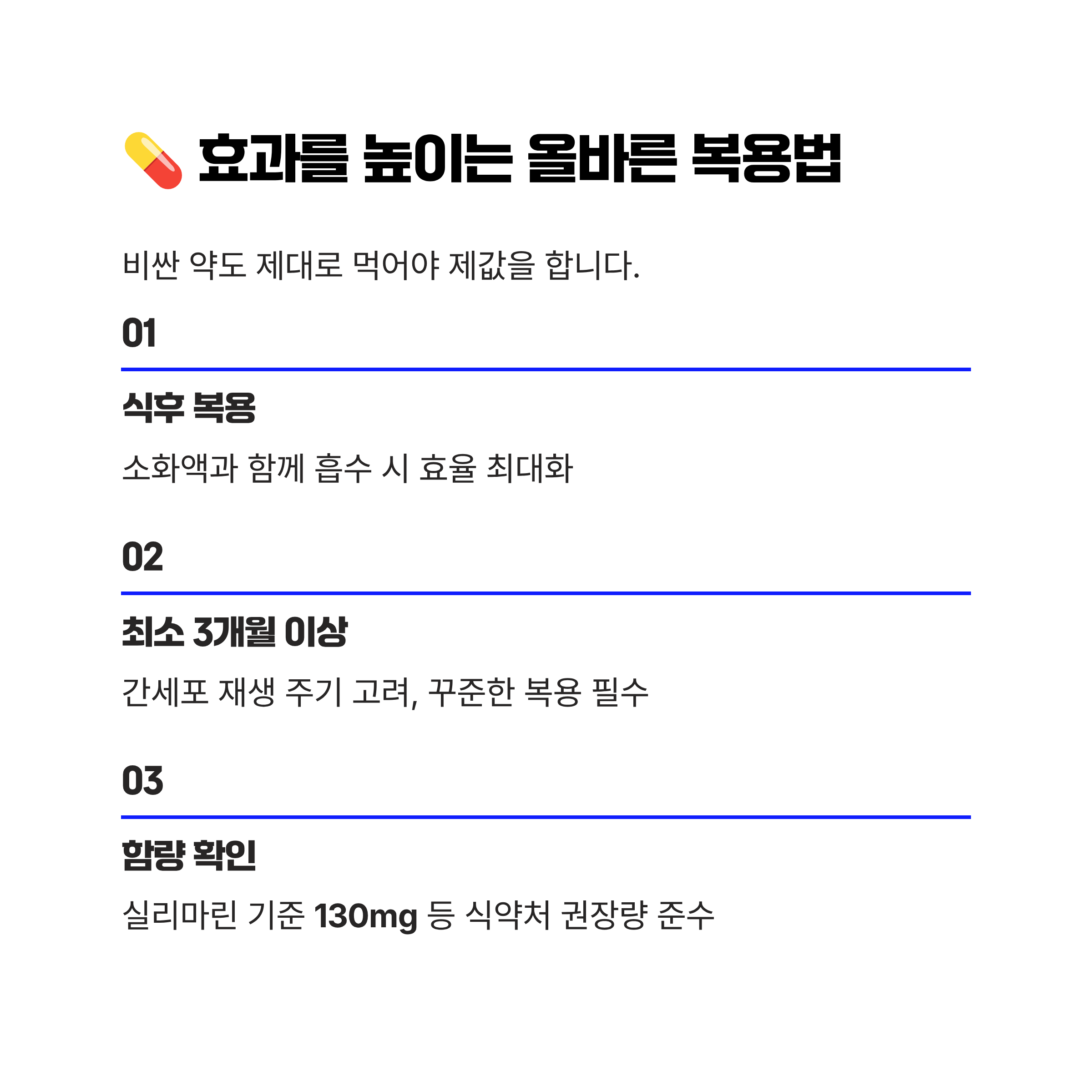 - 함량 확인: 식약처에서 권장하는 일일 섭취량(실리마린 기준 130mg 등)을 준수하는 제품인지 확인하세요.