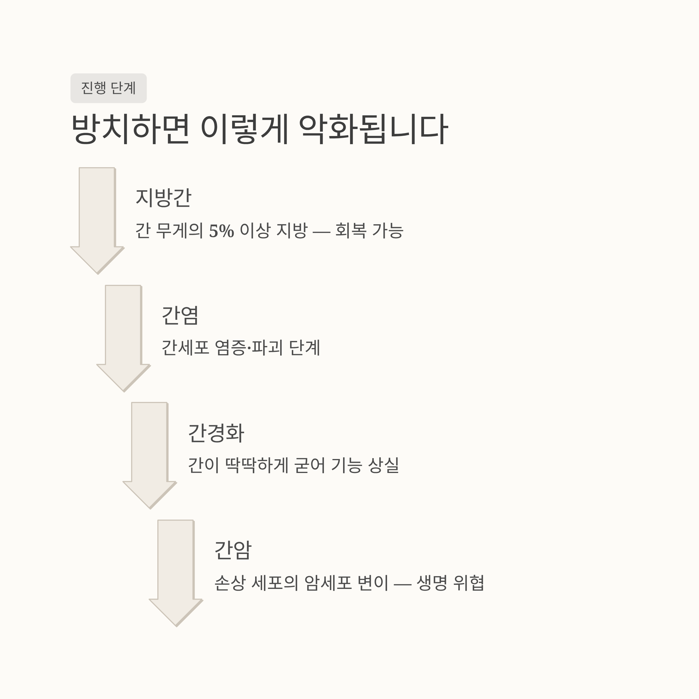 간 질환은 방치할 경우 다음과 같은 단계로 악화되며, 마지막 단계에서는 생명을 위협합니다.