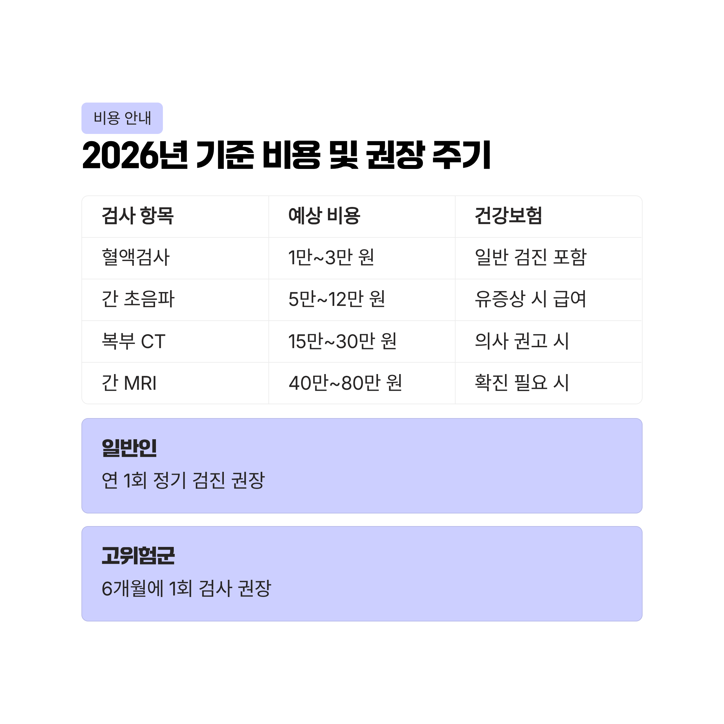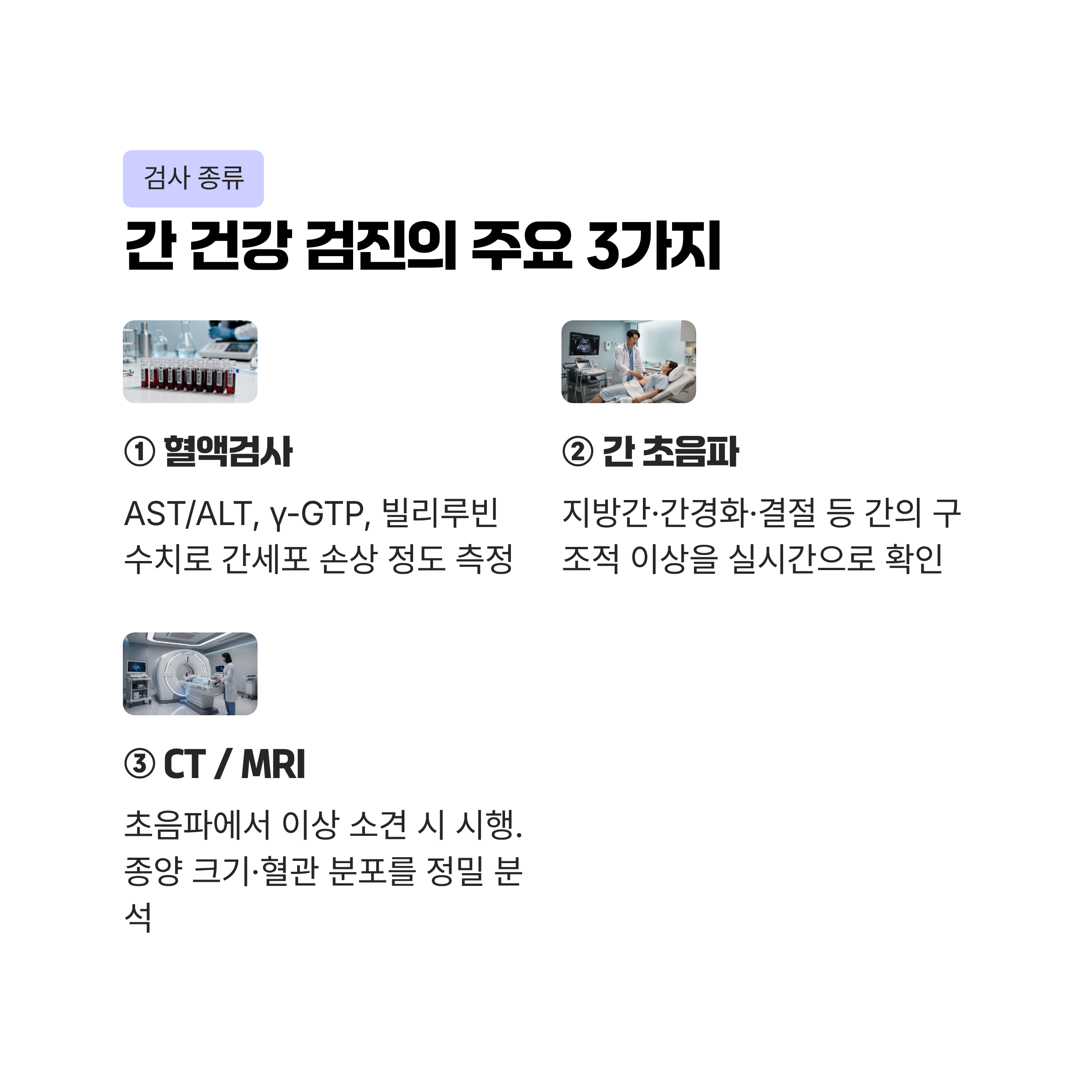 | 구분 | 혈액 검사 | 간 초음파 | 정밀 검사 (CT/MRI) |