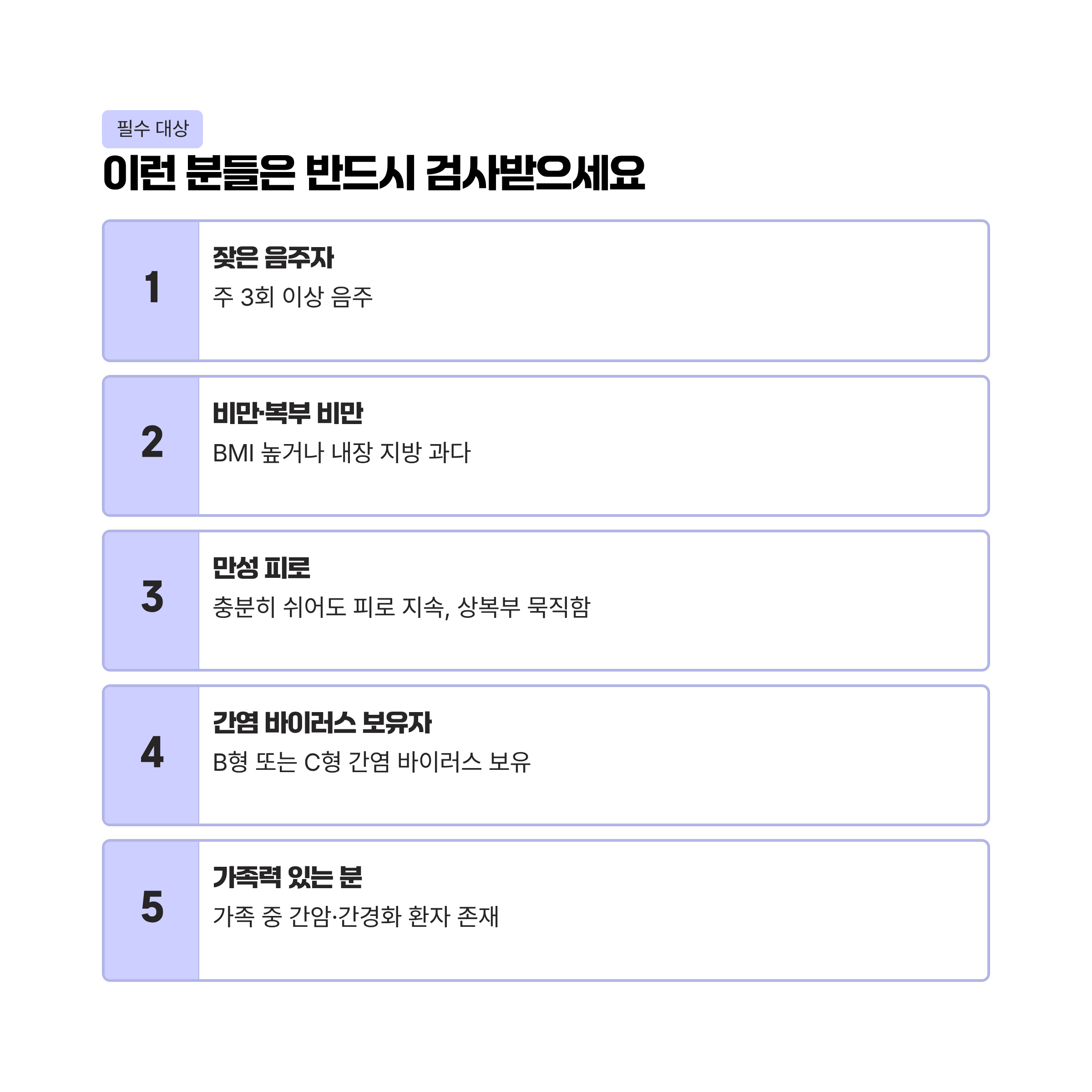 아래 항목 중 하나라도 해당한다면, 이번 검진 시즌에 간 검사를 반드시 포함하세요.