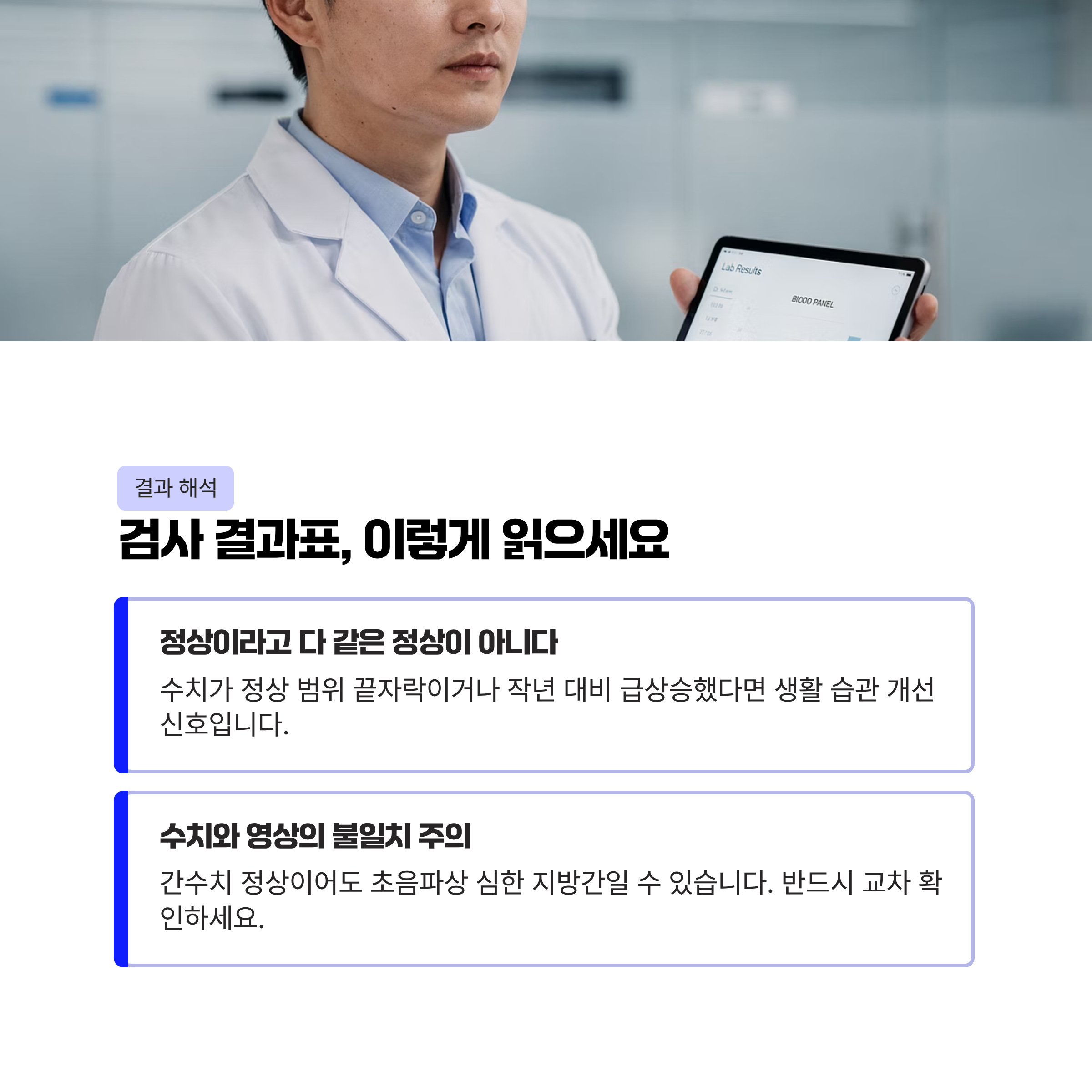 - 수치와 영상의 불일치: 간수치는 정상인데 초음파상으로는 심한 지방간인 경우가 많습니다. 반드시 수치와 영상 결과를 교차 확인해야 합니다.