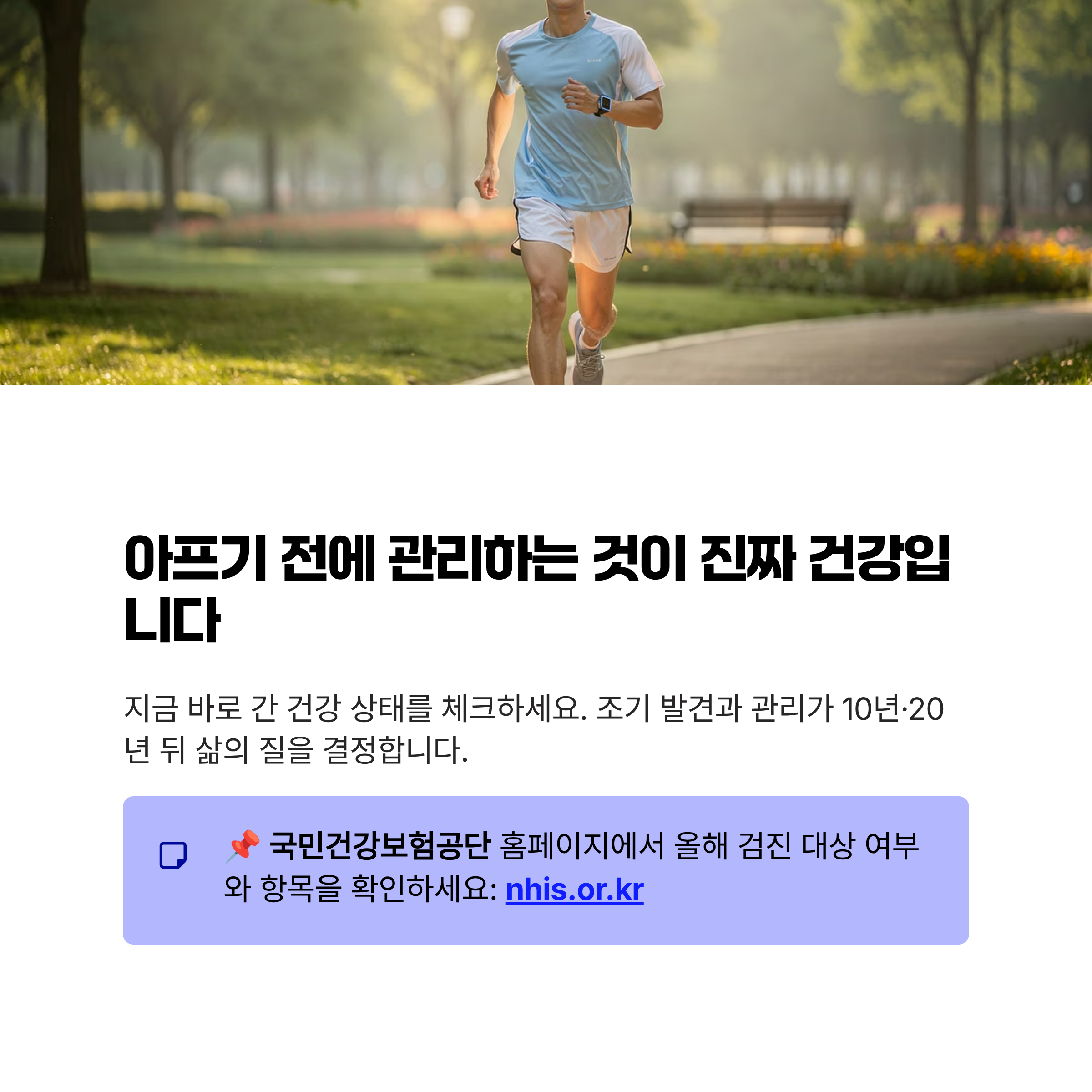 📌 국민건강보험공단 홈페이지에서 본인의 올해 검진 대상 여부와 항목을 꼭 확인하세요: 국민건강보험공단 바로가기