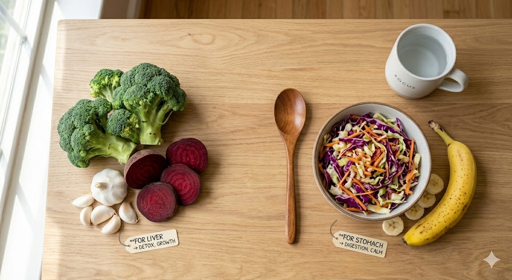 • 위(Stomach)를 위한 루틴: * 양배추와 바나나: 위점막을 보호하고 재생하는 비타민 U와 펙틴이 풍부해요.