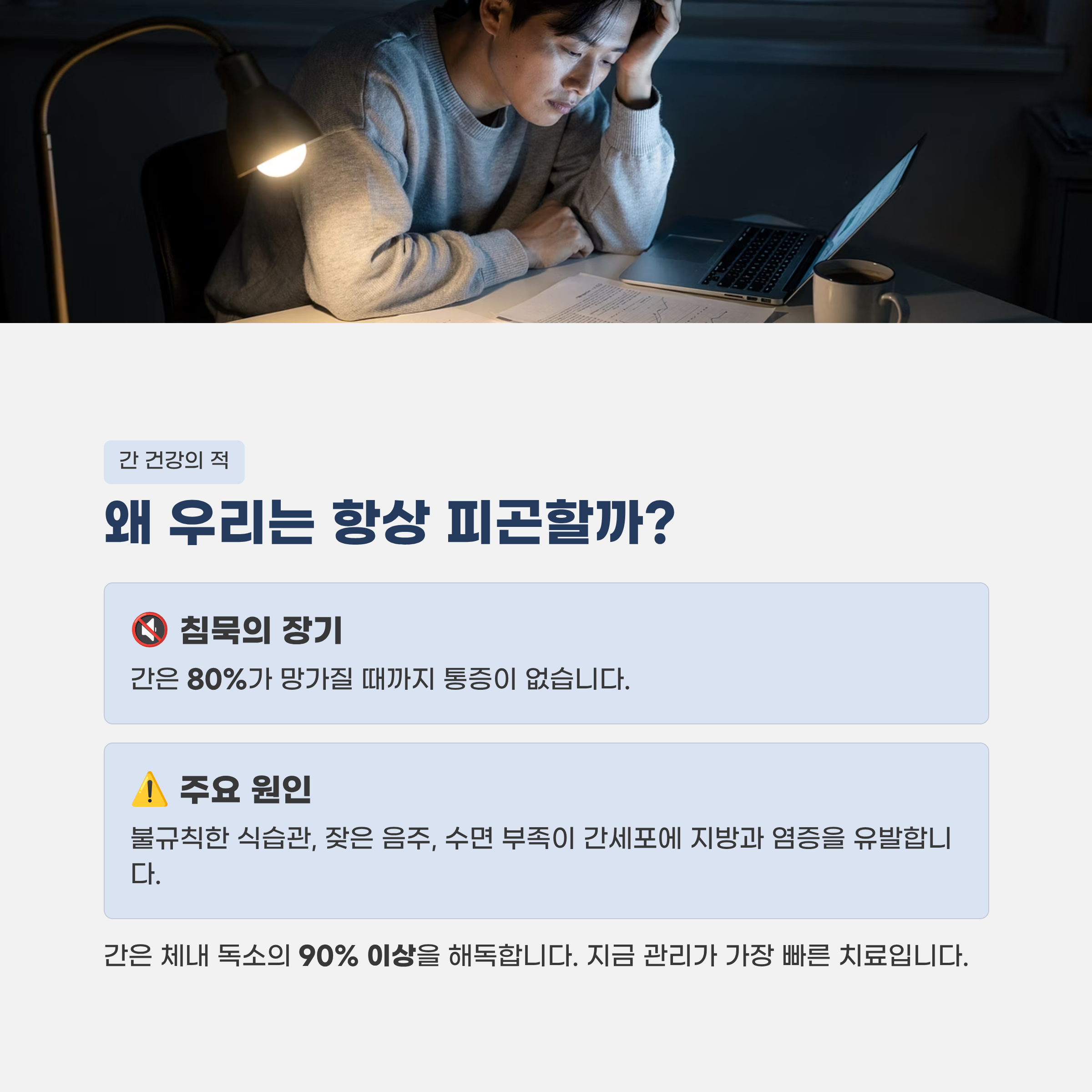 자도 자도 피곤하고 아침에 눈을 뜨는 게 고통스러우신가요? 단순히 나이 탓이나 업무 스트레스라고 생각했던 증상들이 사실은 우리 몸의 화학 공장인 **'간'**이 보내는 구조 신호일 수 있습니다. 특히 지방간은 초기 증상이 거의 없어 방치하기 쉽지만, 다행히 간은 우리가 올바른 습관만 제공한다면 스스로를 치유하는 놀라운 재생 능력을 갖추고 있습니다.
