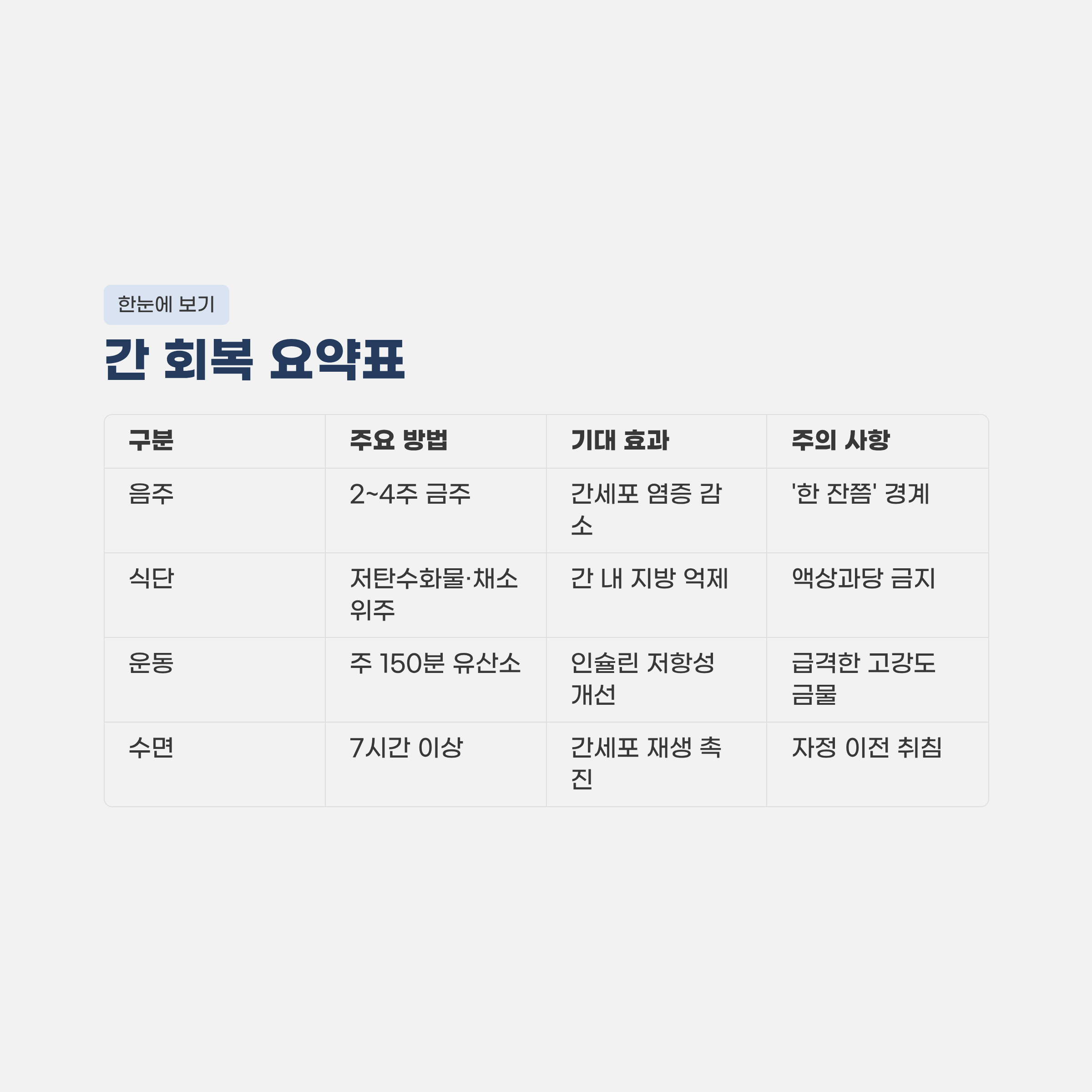 | 음주 | 2~4주 금주 | 간세포 염증 감소 | '한 잔쯤'을 경계할 것 |
