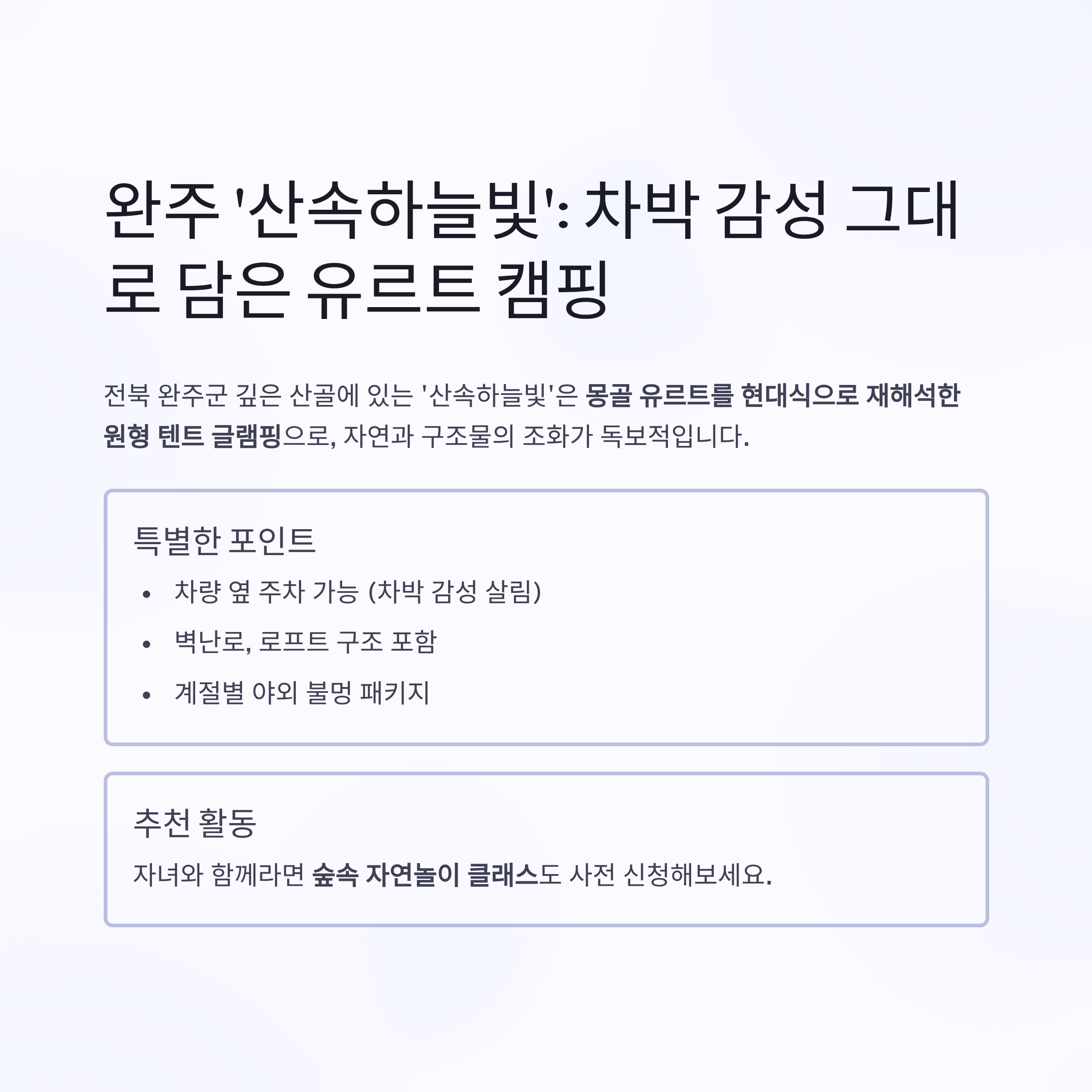 완주 ‘산속하늘빛’: 차박 감성 그대로 담은 유르트 캠핑