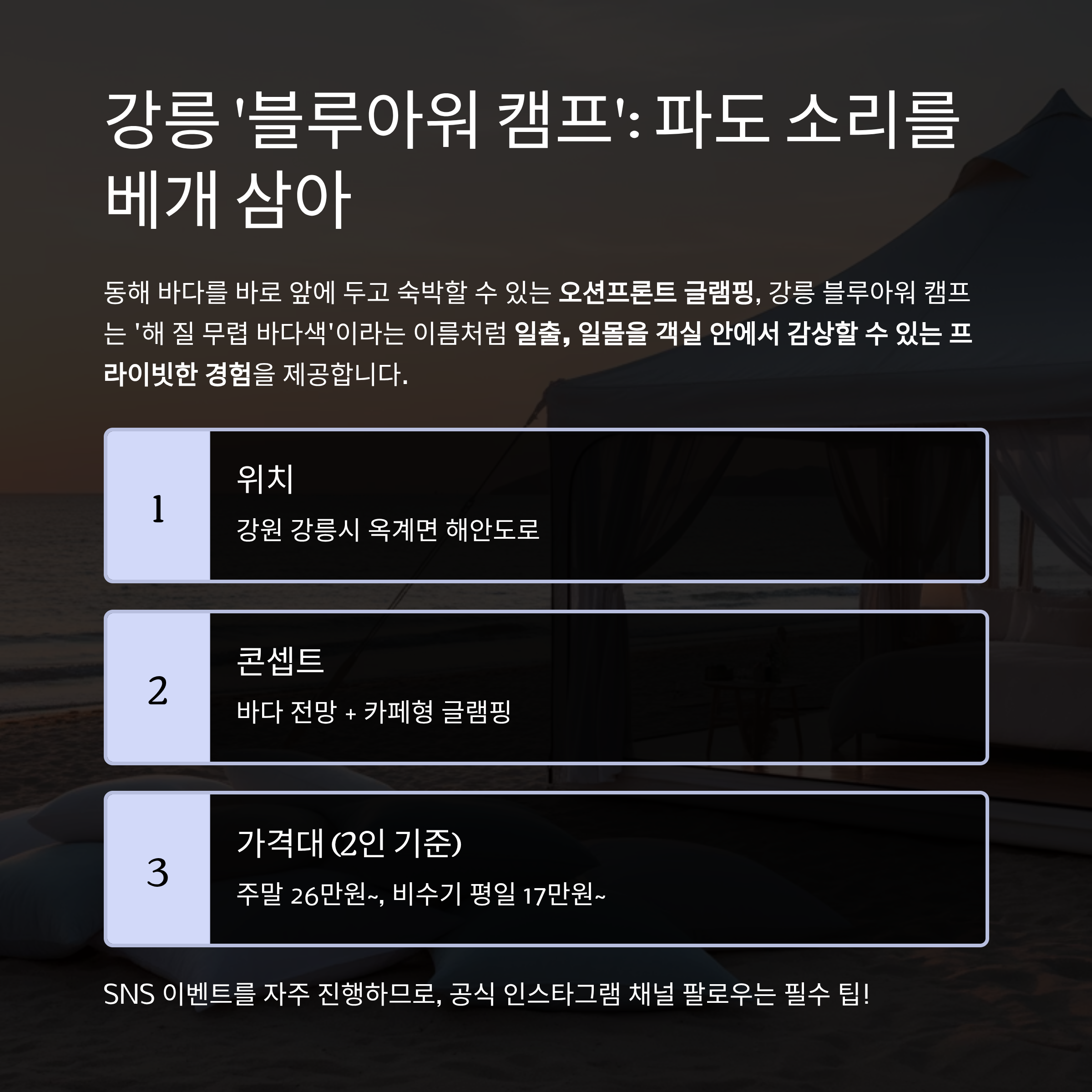 | 콘셉트 | 바다 전망 + 카페형 글램핑 |