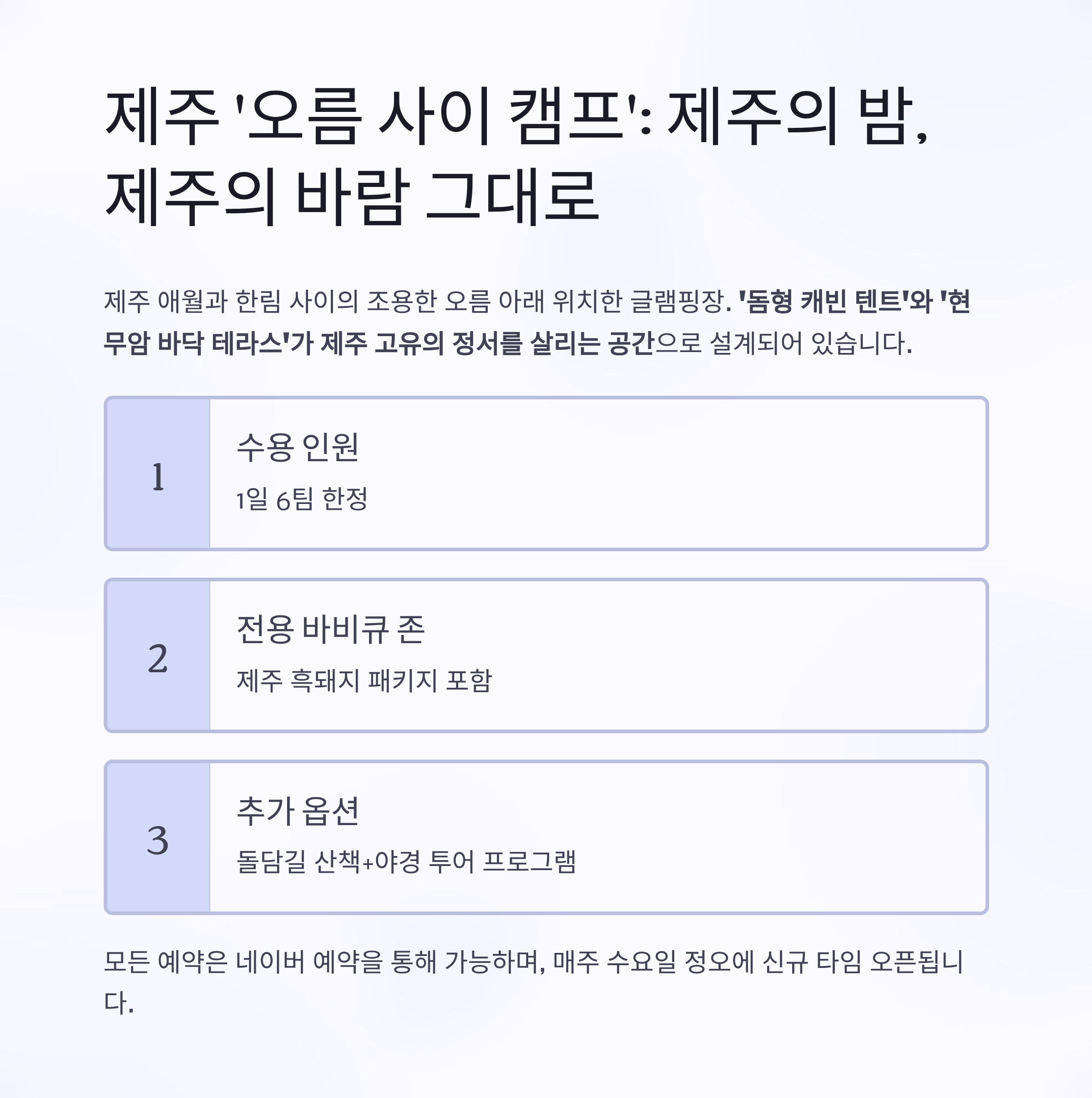 ‘돔형 캐빈 텐트’와 ‘현무암 바닥 테라스’가 제주 고유의 정서를 살리는 공간으로 설계되어 있습니다.