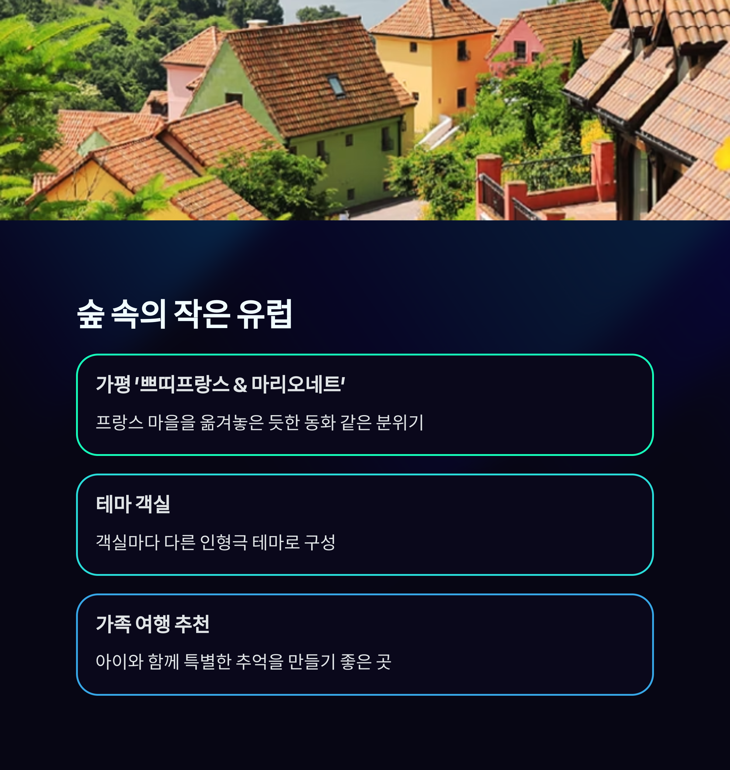 | 쁘띠프랑스 | 유럽 테마 숙소 | 가족, 커플 | 테마 객실, 숲속 위치 |