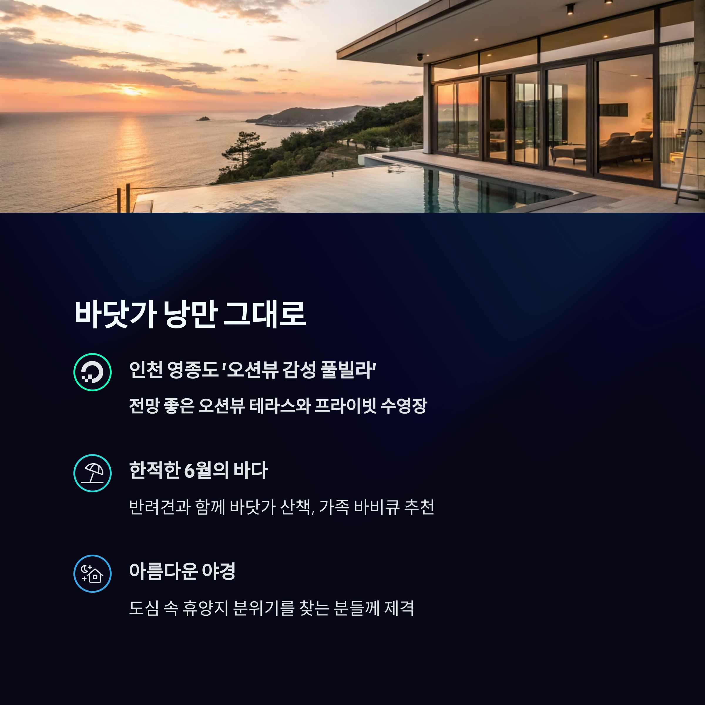 | 영종도 풀빌라 | 바다 앞 풀빌라 | 가족, 연인 | 오션뷰, 프라이빗 수영장, 바비큐 가능 |