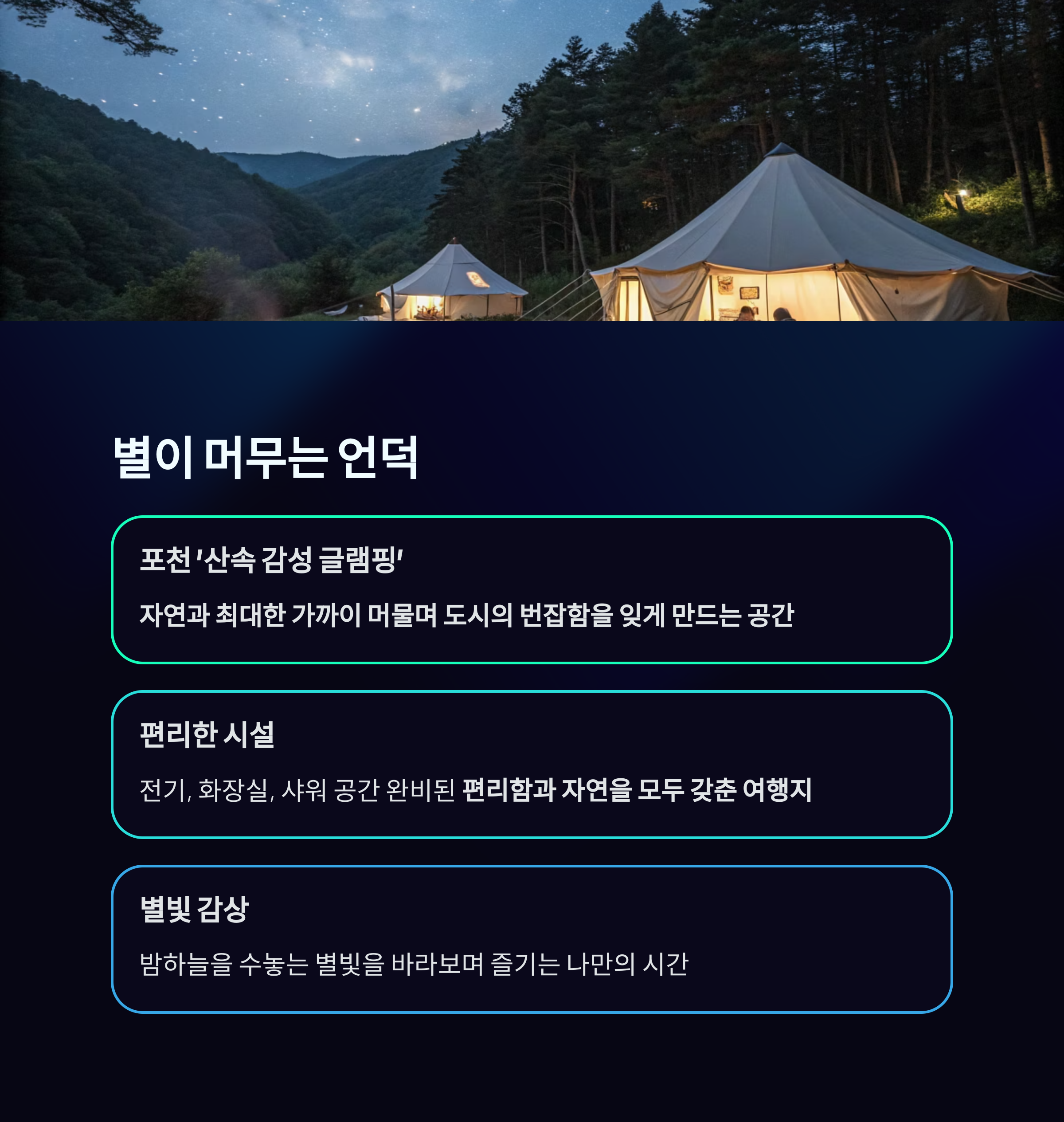 | 포천 글램핑 | 산속 힐링 캠핑 | 솔로, 가족 | 별밤 감성, 전기/샤워 완비 |