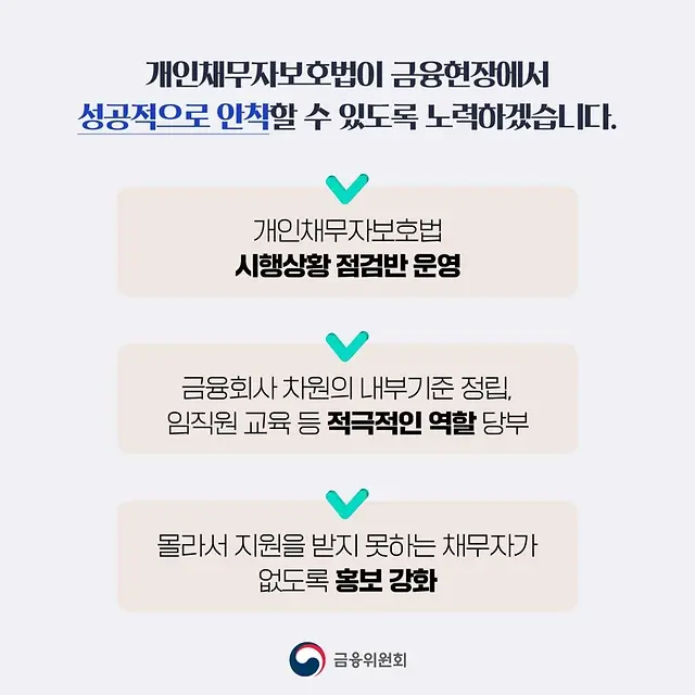 이번 법은 채무를 갚지 못해서 어려움을 겪고 있는 분들에게 많은 혜택을 제공합니다. 채무자는 이제 금융회사와 채무 문제를 직접 처리할 수 있으므로, 추심에 대해 특별히 책임을 져야 합니다.
