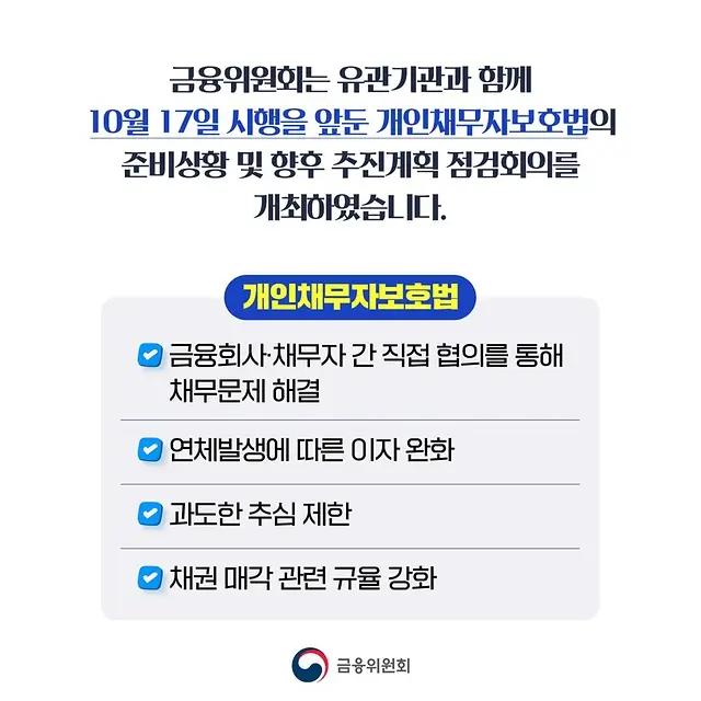 2024년 10월 17일부터 시행되는 개인채무자보호법은 개인채무자의 재기를 인정, 연체로 인한 사회적 문제를 해결하기위한 중요한 법입니다. 이번 법률로 금융회사와 채무자 간 협력을 통해 문제를 해결할 수 있는 다양한 제도적 장치가 등장했습니다.